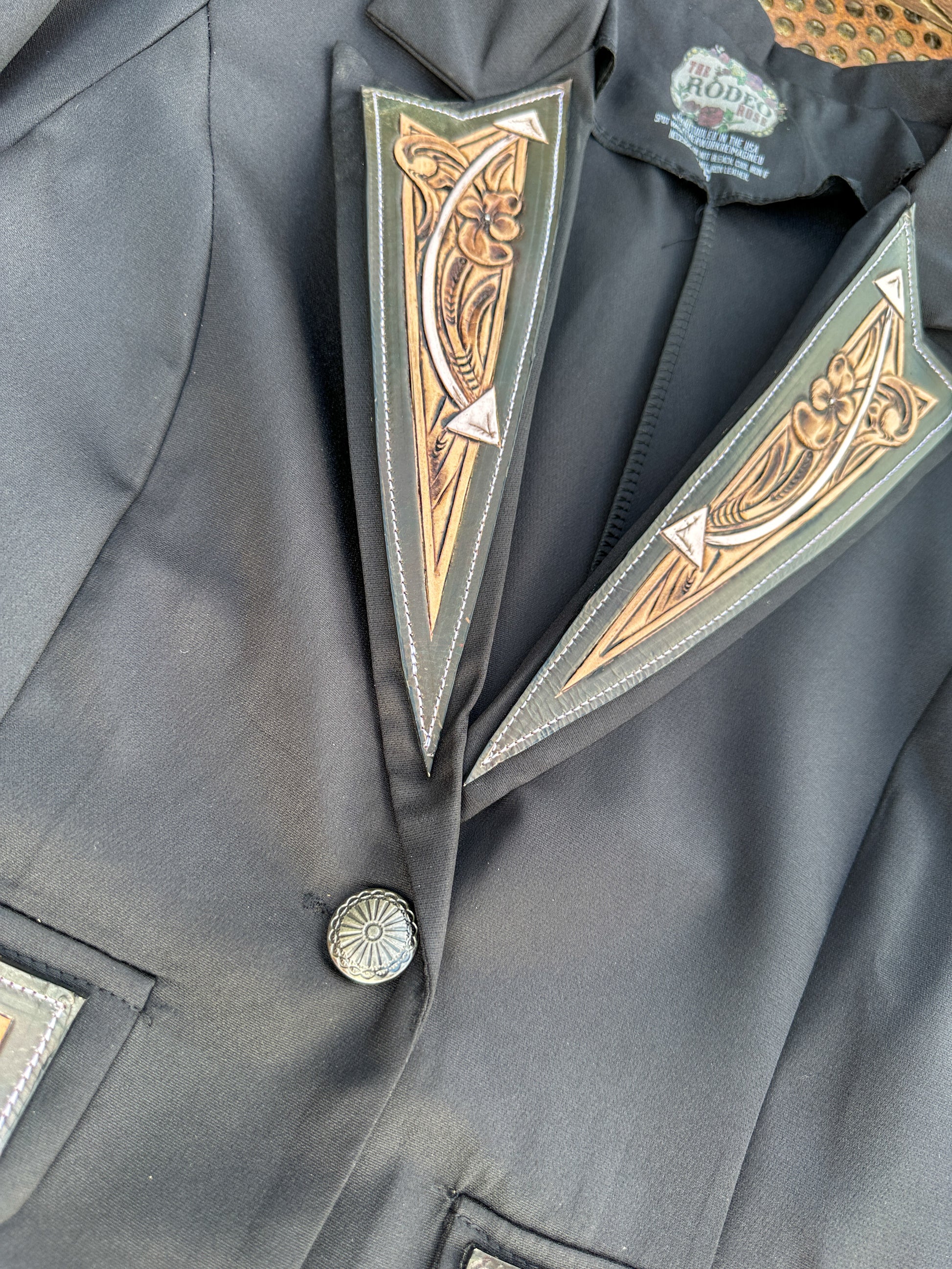 Experience the unique craftsmanship of our classic Arrow Hand Tooled Lapel Blazer! Each blazer features a one-of-a-kind boot stitch floral tooled pattern, handcrafted in The Rodeo Rose shop in South Dakota. With faux pockets and a perfect fit, you'll love the originality and comfort of this long sleeve blazer.