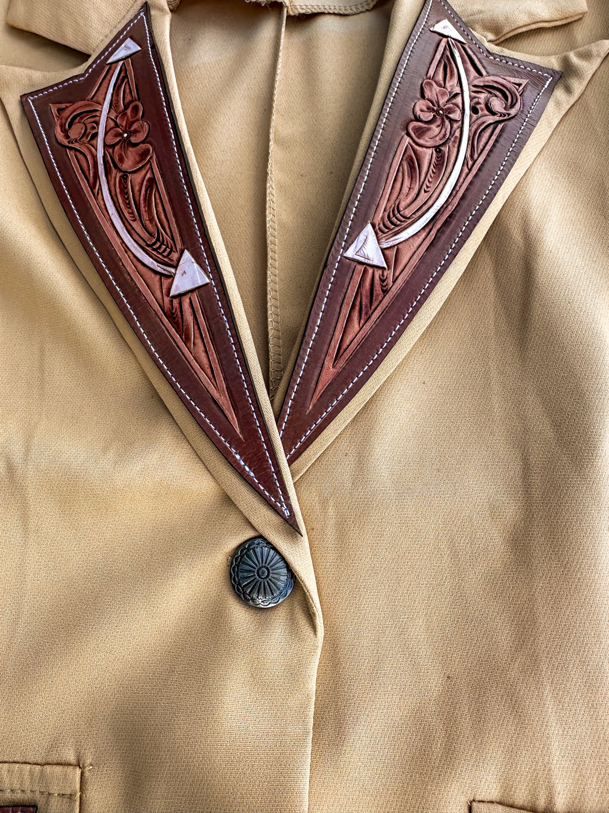 Experience the unique craftsmanship of our classic Arrow Hand Tooled Lapel Blazer! Each tan blazer features a one-of-a-kind boot stitch floral tooled pattern, handcrafted in The Rodeo Rose shop in South Dakota. With faux pockets and a perfect fit, you'll love the originality and comfort of this long sleeve blazer.