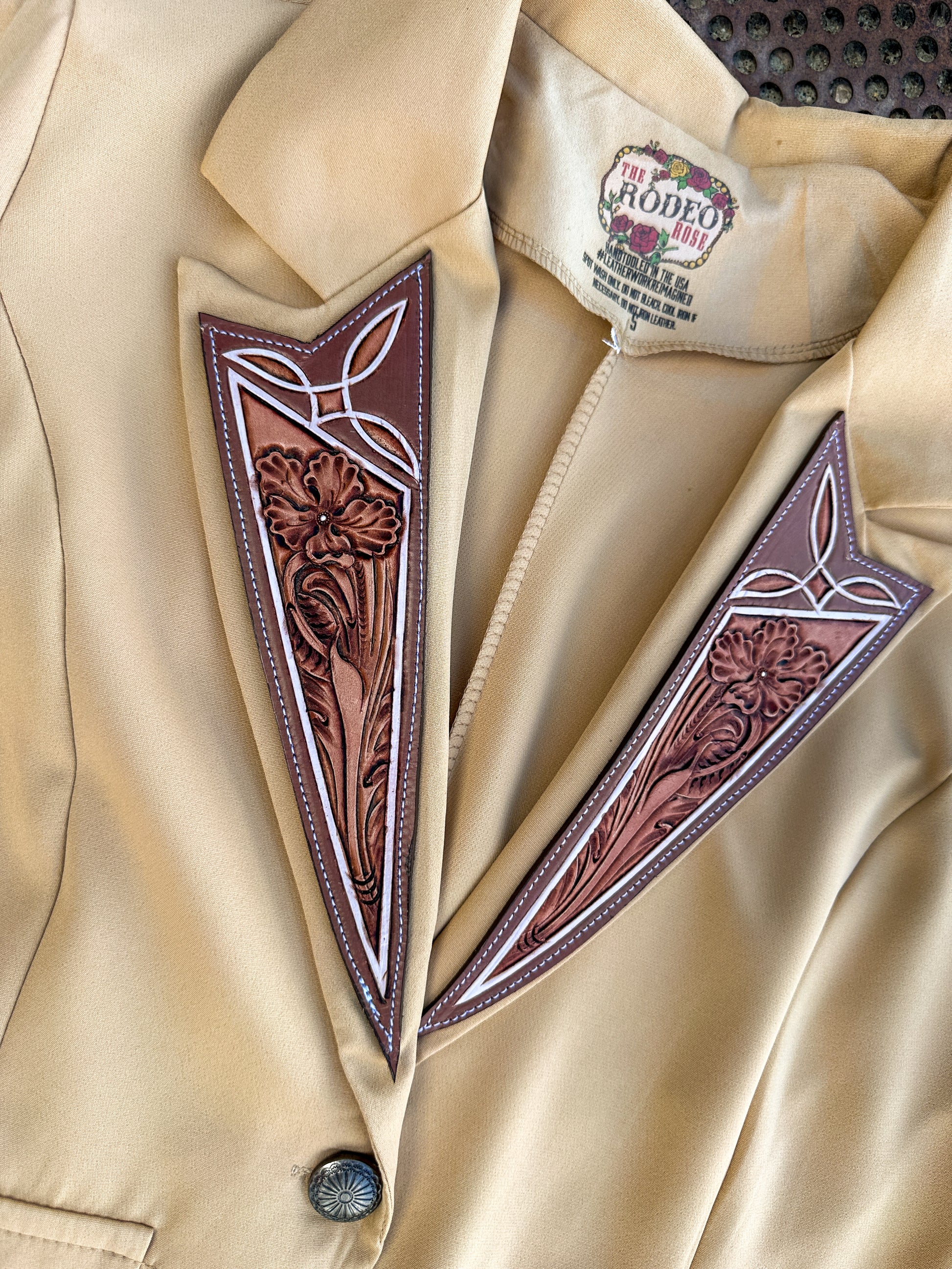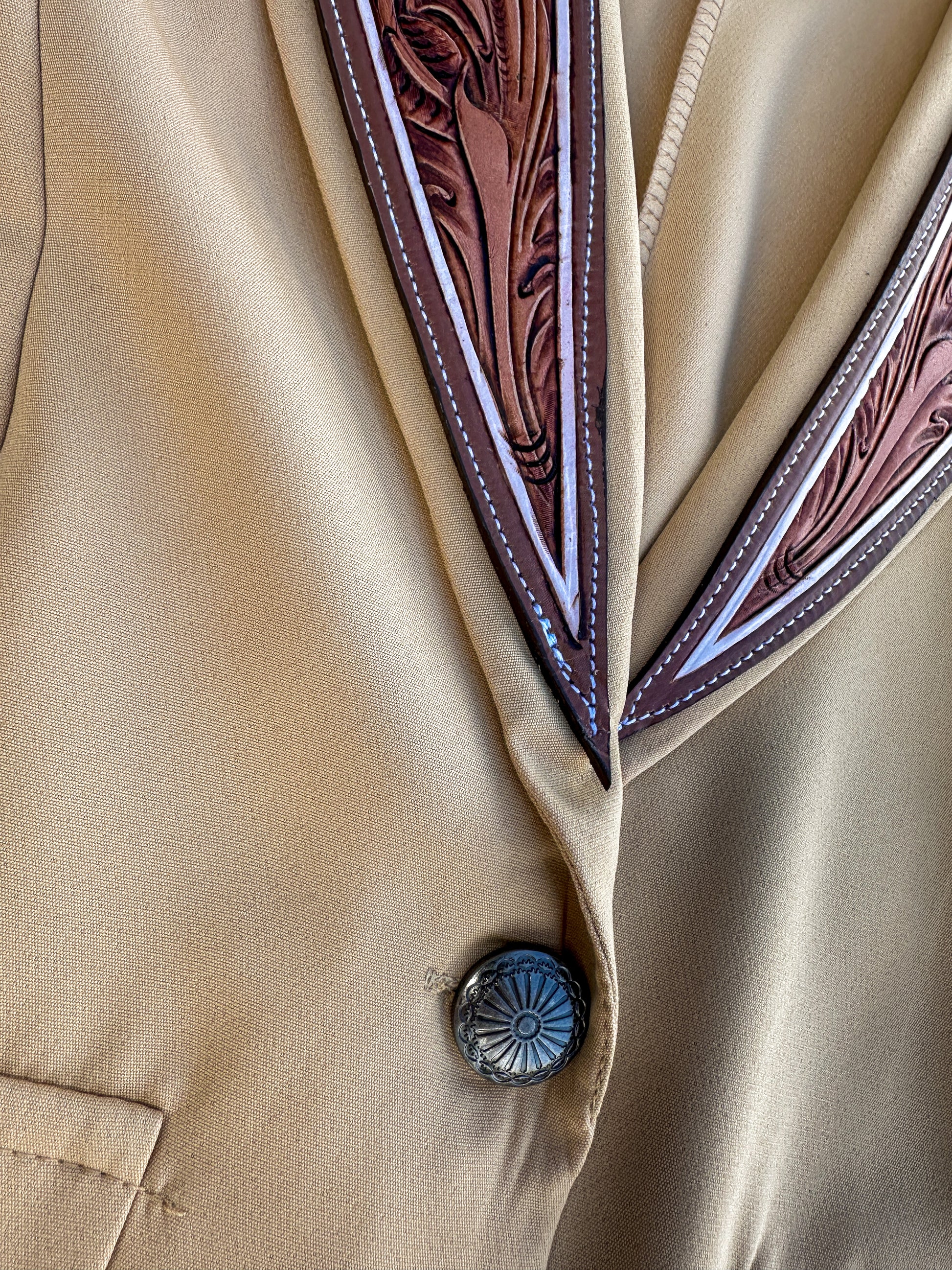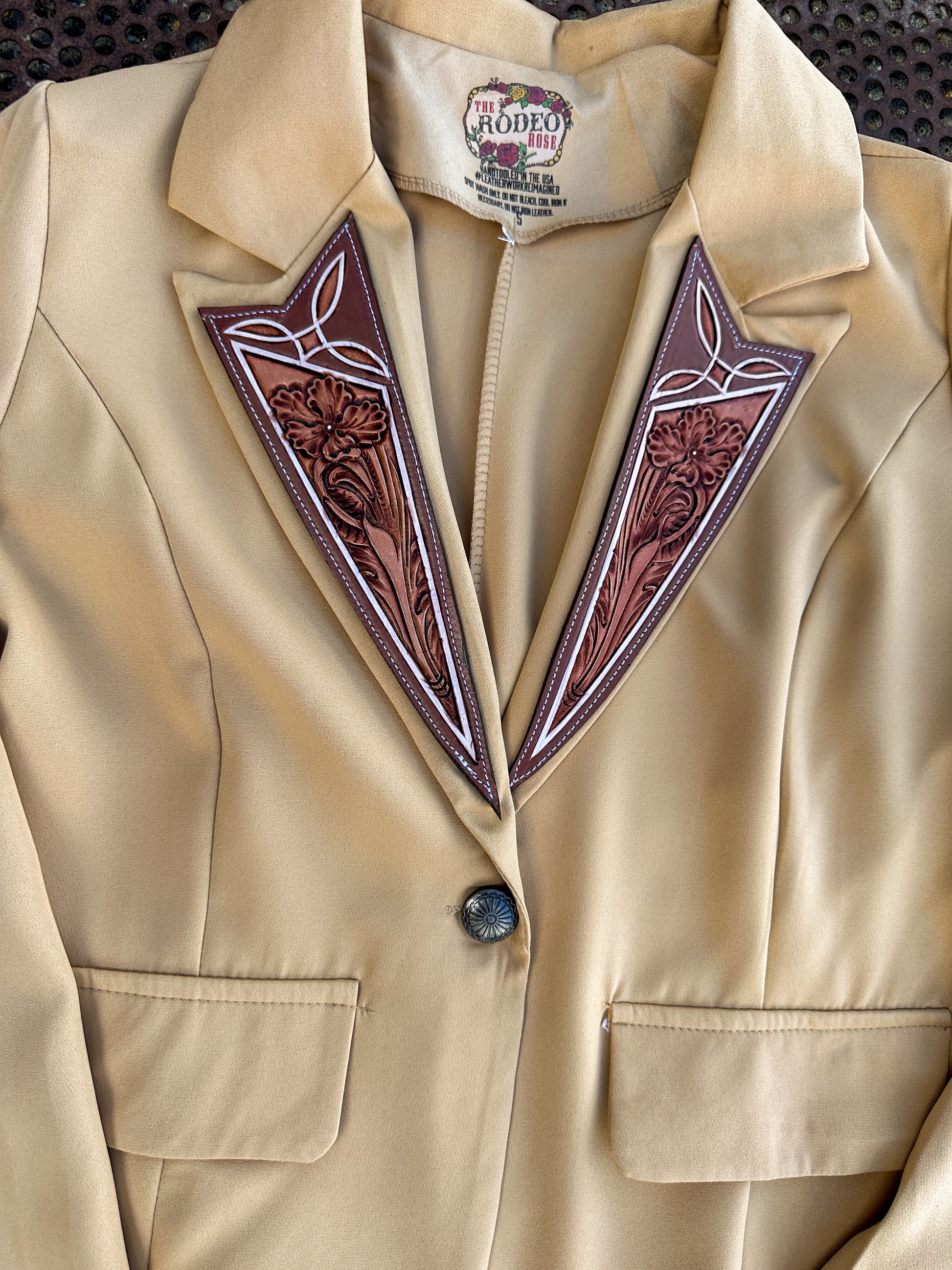 Experience the unique craftsmanship of our Boot Stitch Hand Tooled Lapel Blazer! Each tan blazer features a one-of-a-kind boot stitch floral tooled pattern, handcrafted in The Rodeo Rose shop in South Dakota. With faux pockets and a perfect fit, you'll love the originality and comfort of this long sleeve blazer.