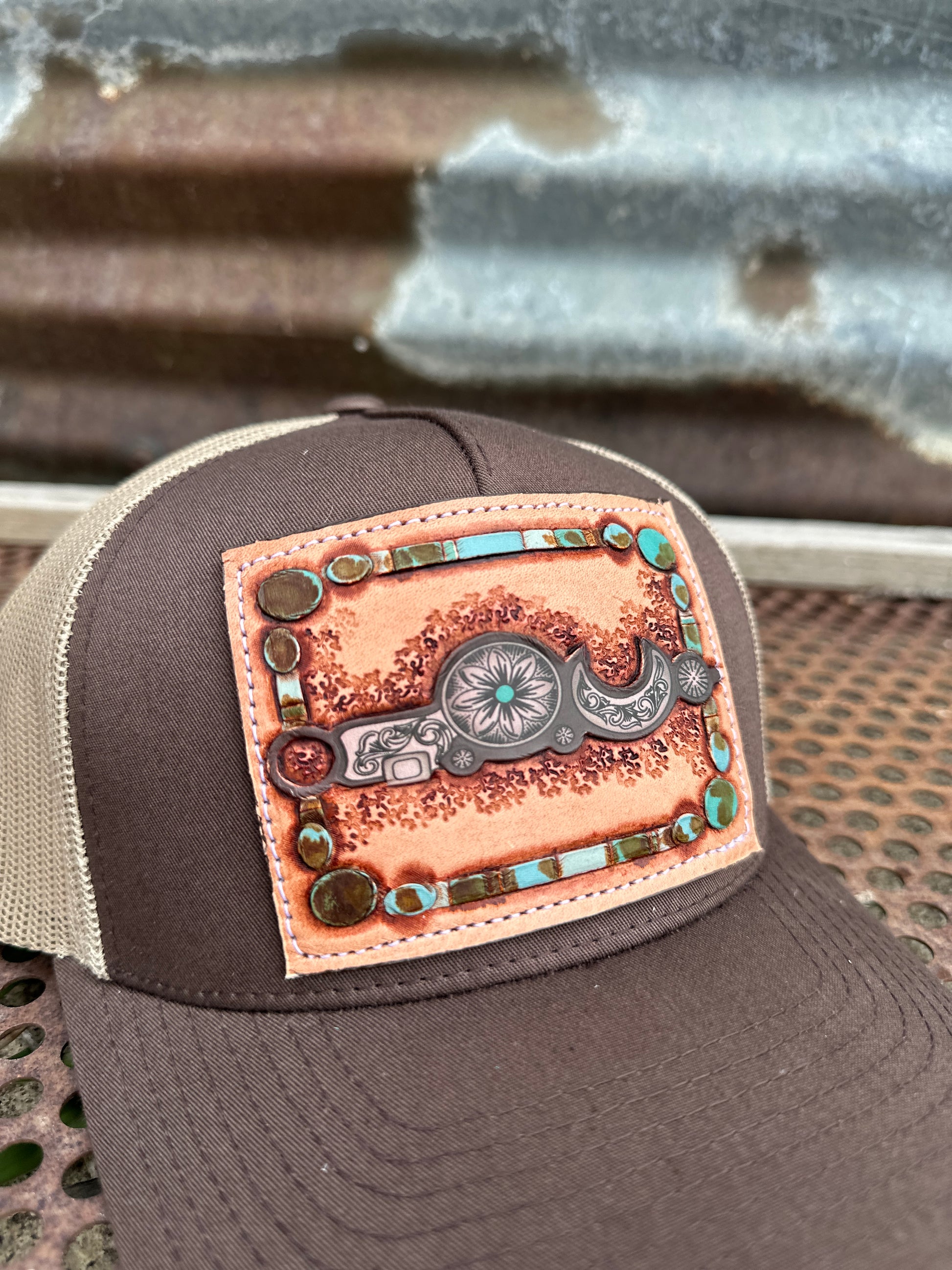 The iconic bridle bit is the epidemy of the working horse. Years and work go into bridle bit horses. The hand tooled bridle cap embraces the high class of the bridle horse. Hand tooled and antiqued with a beautiful turquoise border. Classy, unique and made in the USA, just like bridle horses.