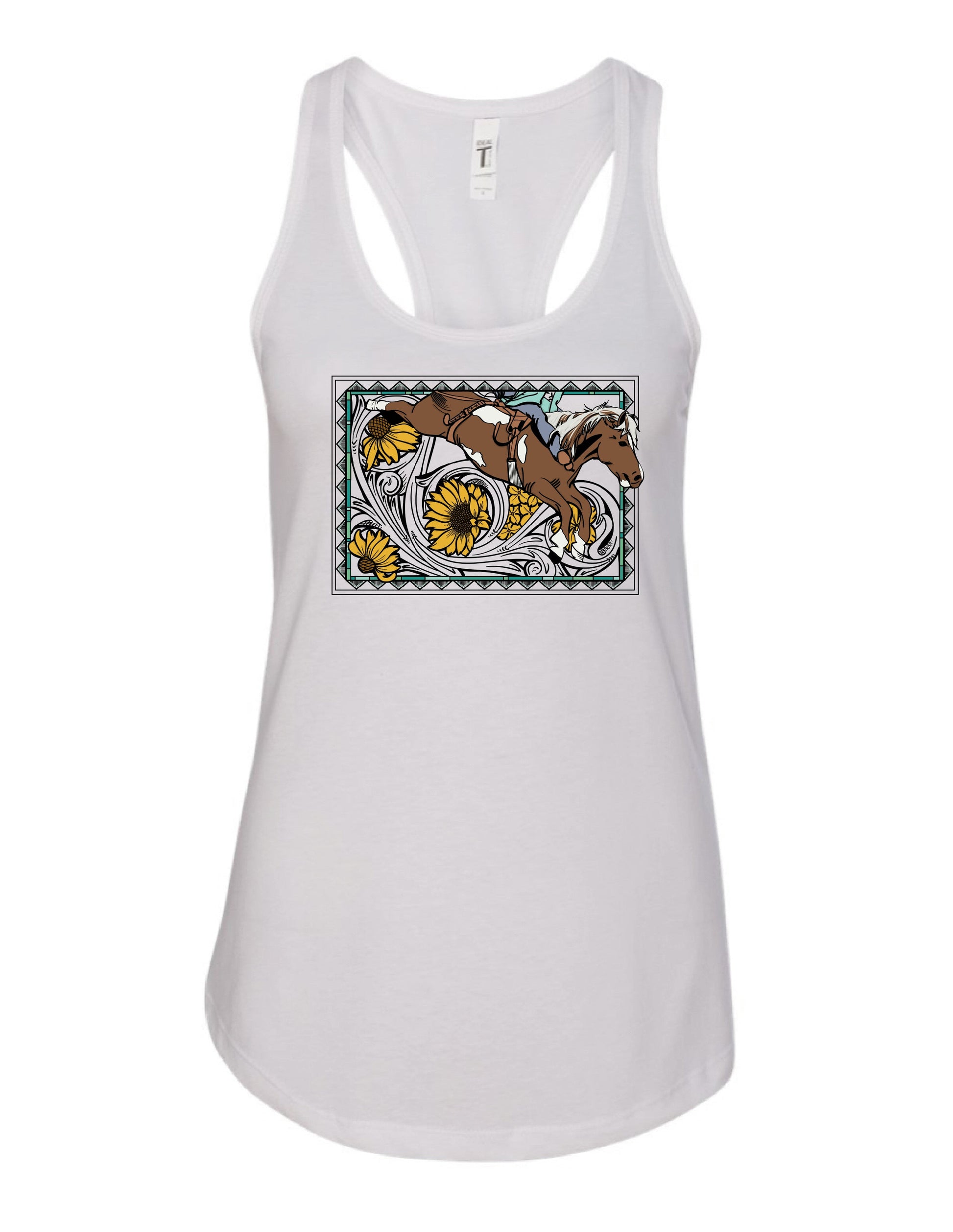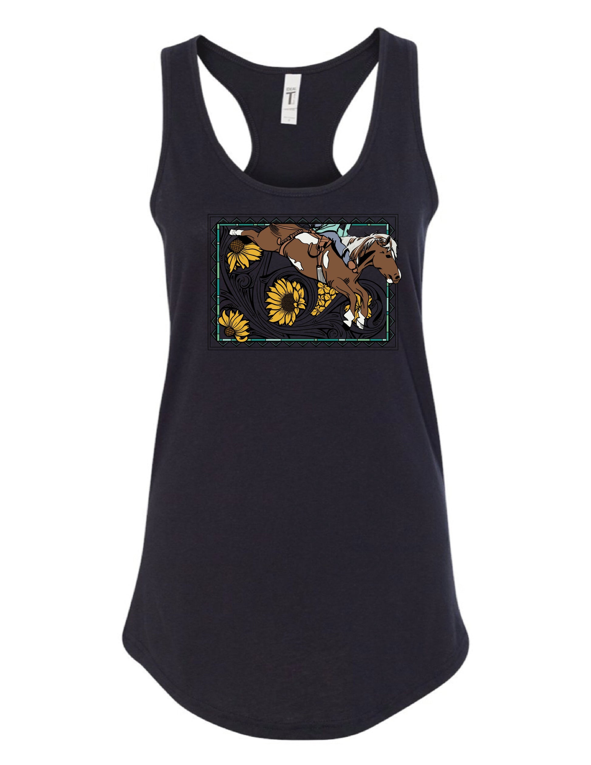 Introducing the "Barback Horse" graphic by Amanda Rose, exclusively at The Rodeo Rose. This captivating design features a majestic horse bucking through tooled leather floral scrolls, sunflowers, and cone flowers. The Southwest-inspired border boasts intricate turquoise detailing in four vibrant shades. Hand-drawn and printed with care in South Dakota, USA, this graphic embodies the spirit of the cowboy. Bring a touch of rodeo to your wardrobe with this stunning artwork on a relaxed fit jersey t-shirt from The Rodeo Rose.