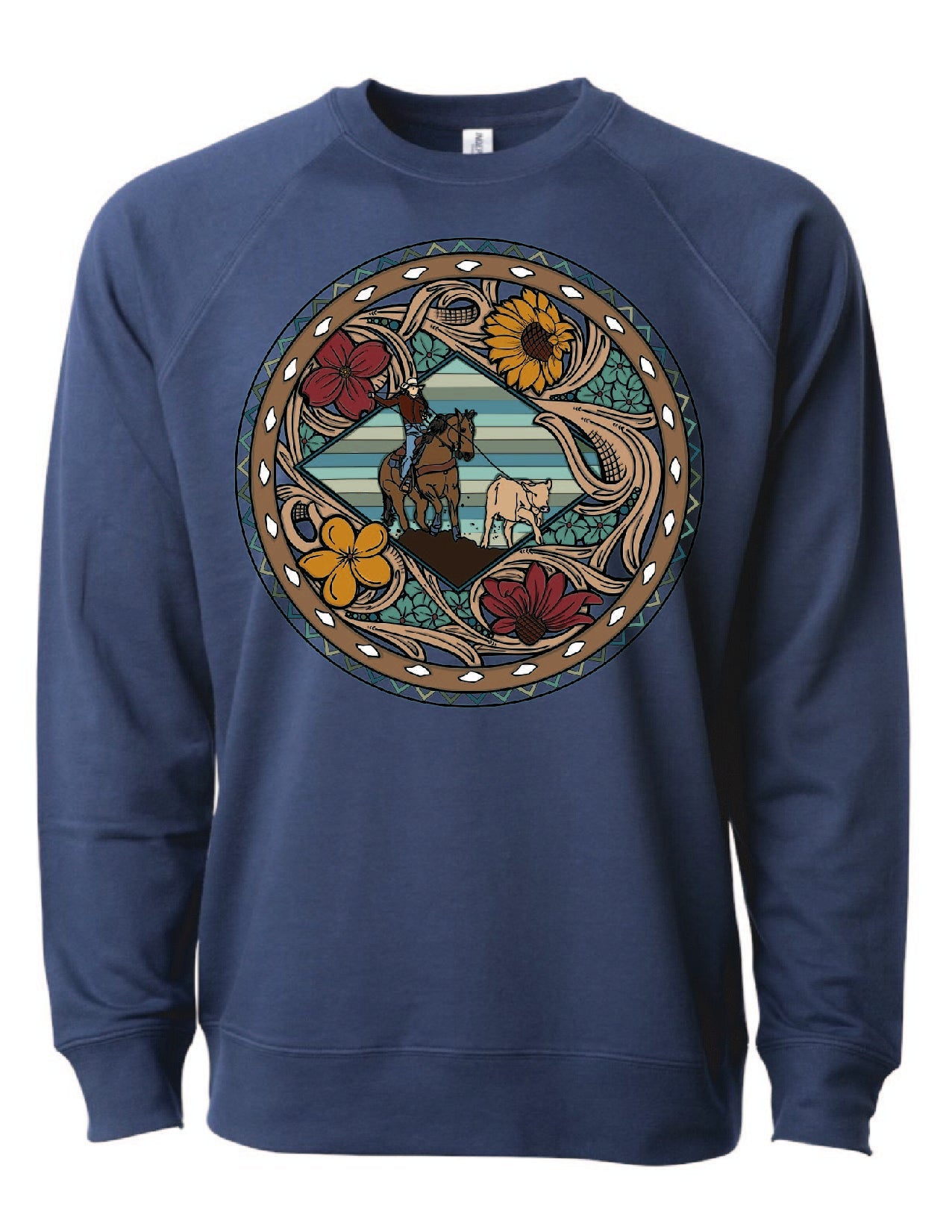 Introducing our Break Away crewneck sweatshirt. This sweatshirt features original Breakaway Roper graphic artwork, surrounded by hand-tooled floral designs resembling a rope can. Combining comfort with Western flair, it's a bold statement of your favorite rodeo event.