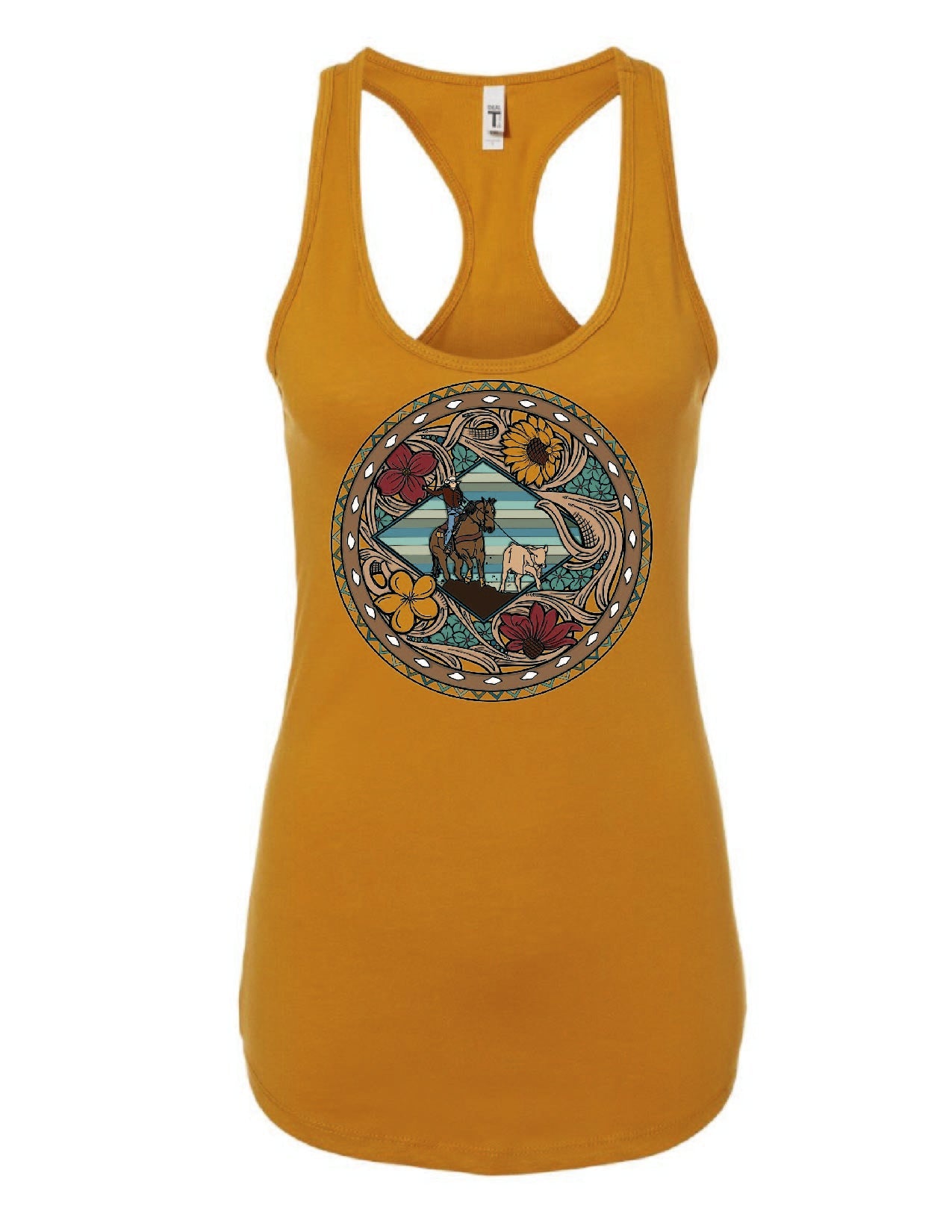 Introducing our Break Away Tank. This relaxed tank features original Breakaway Roper graphic artwork, surrounded by hand-tooled floral designs resembling a rope can. Combining comfort with Western flair, it's a bold statement of your favorite rodeo event.