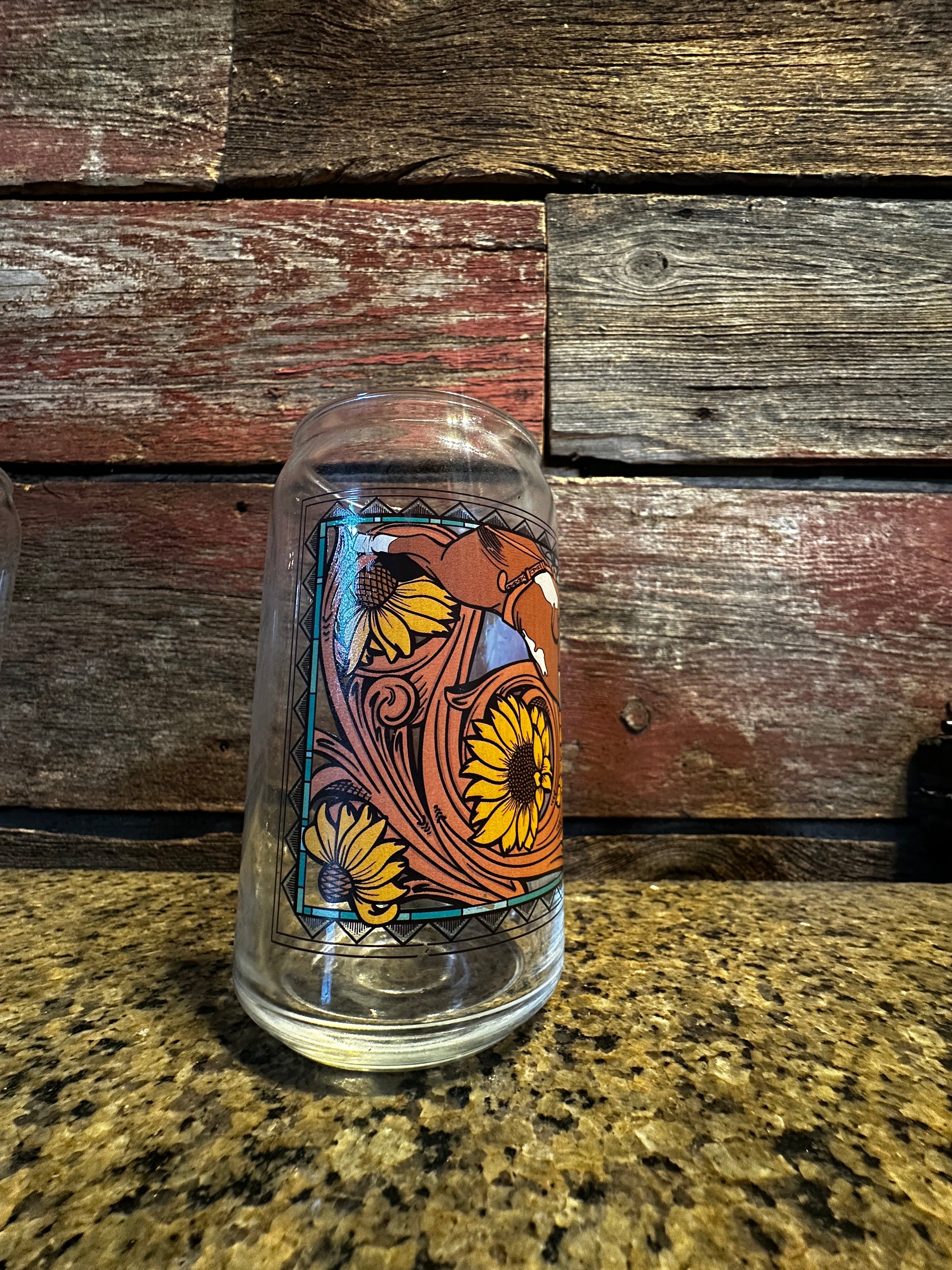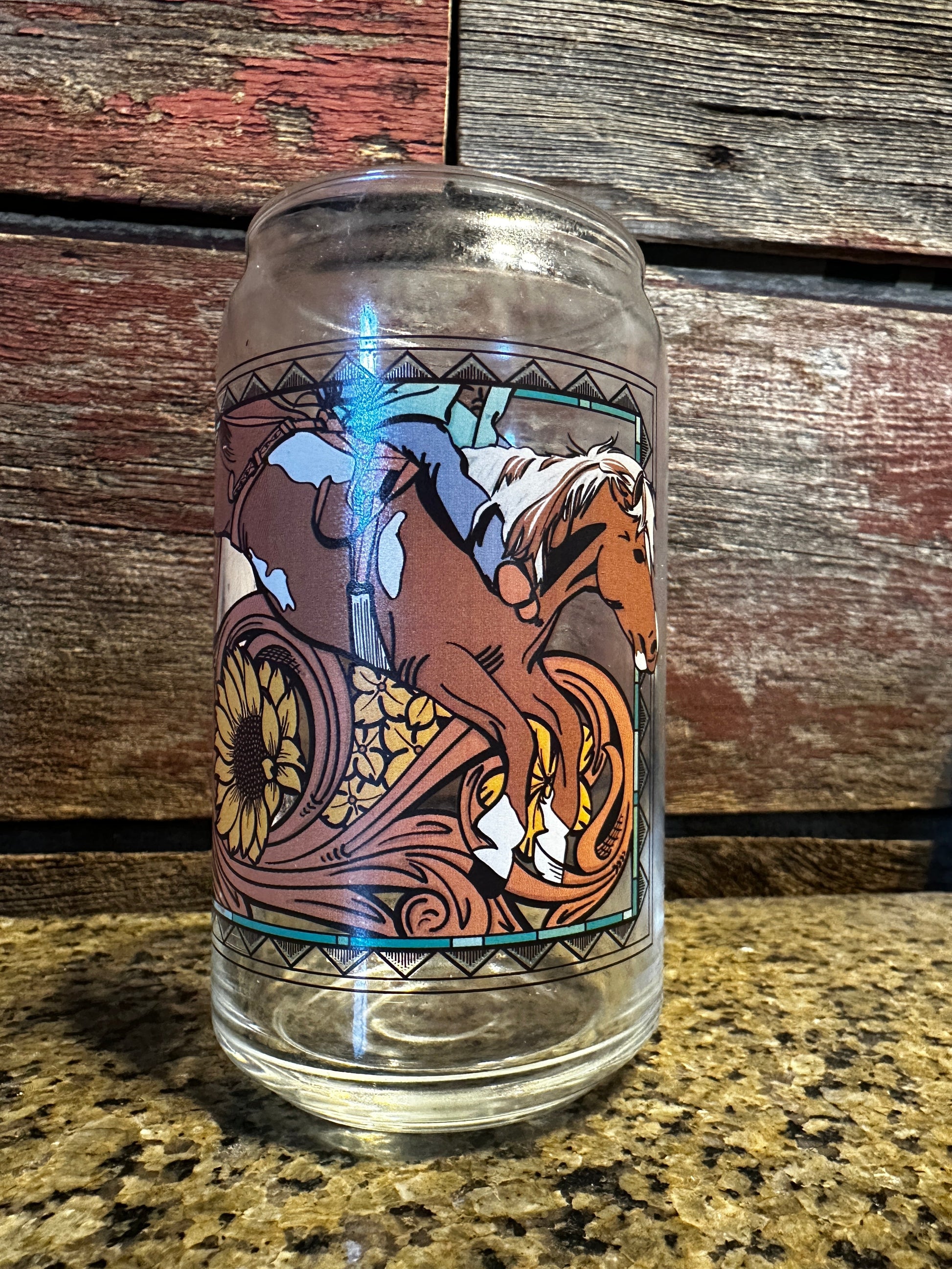 This can glass features a bareback horse with floral tooled design, meticulously crafted in the USA. Enjoy your favorite beverages in style with this uniquely detailed glassware.