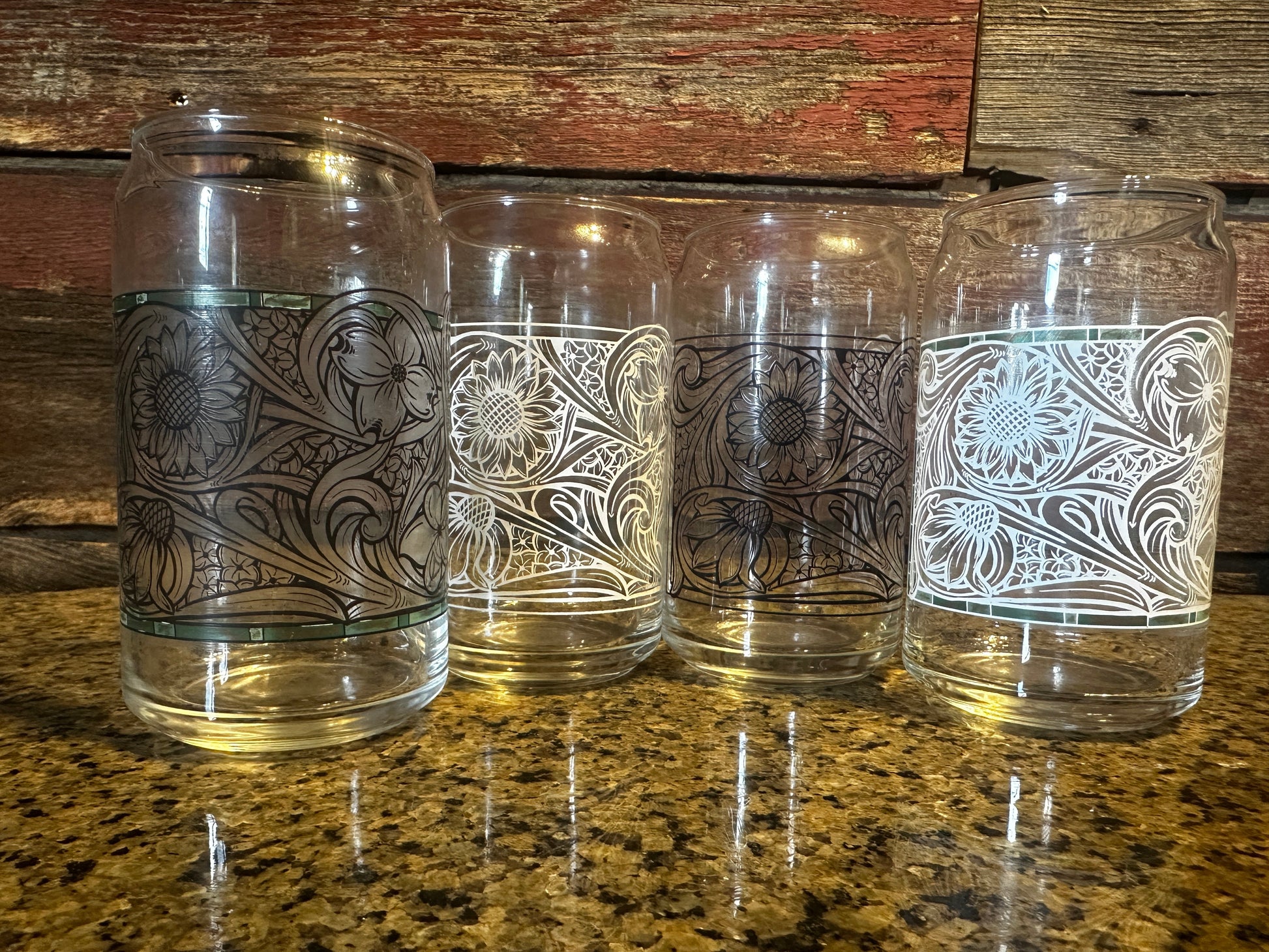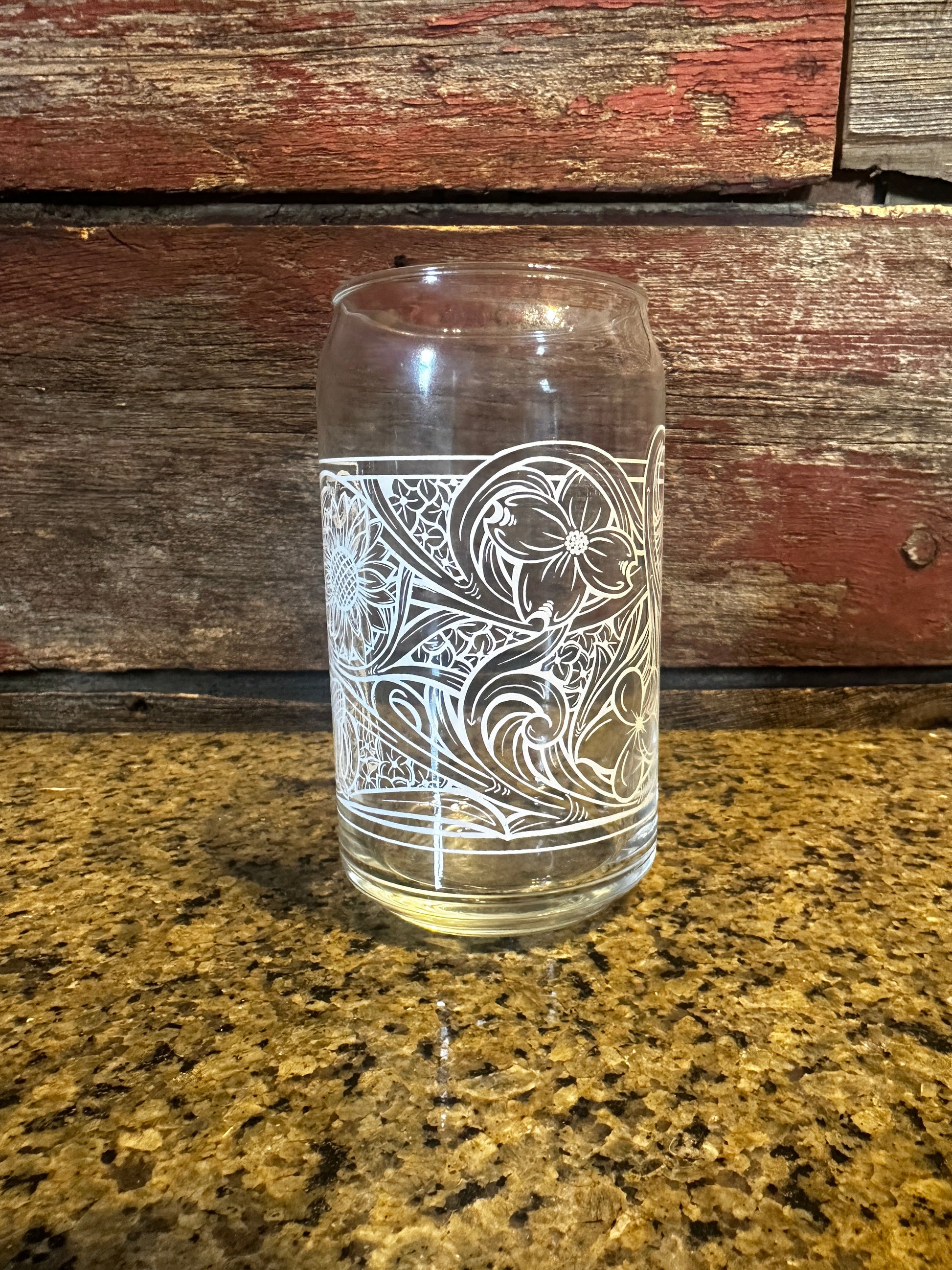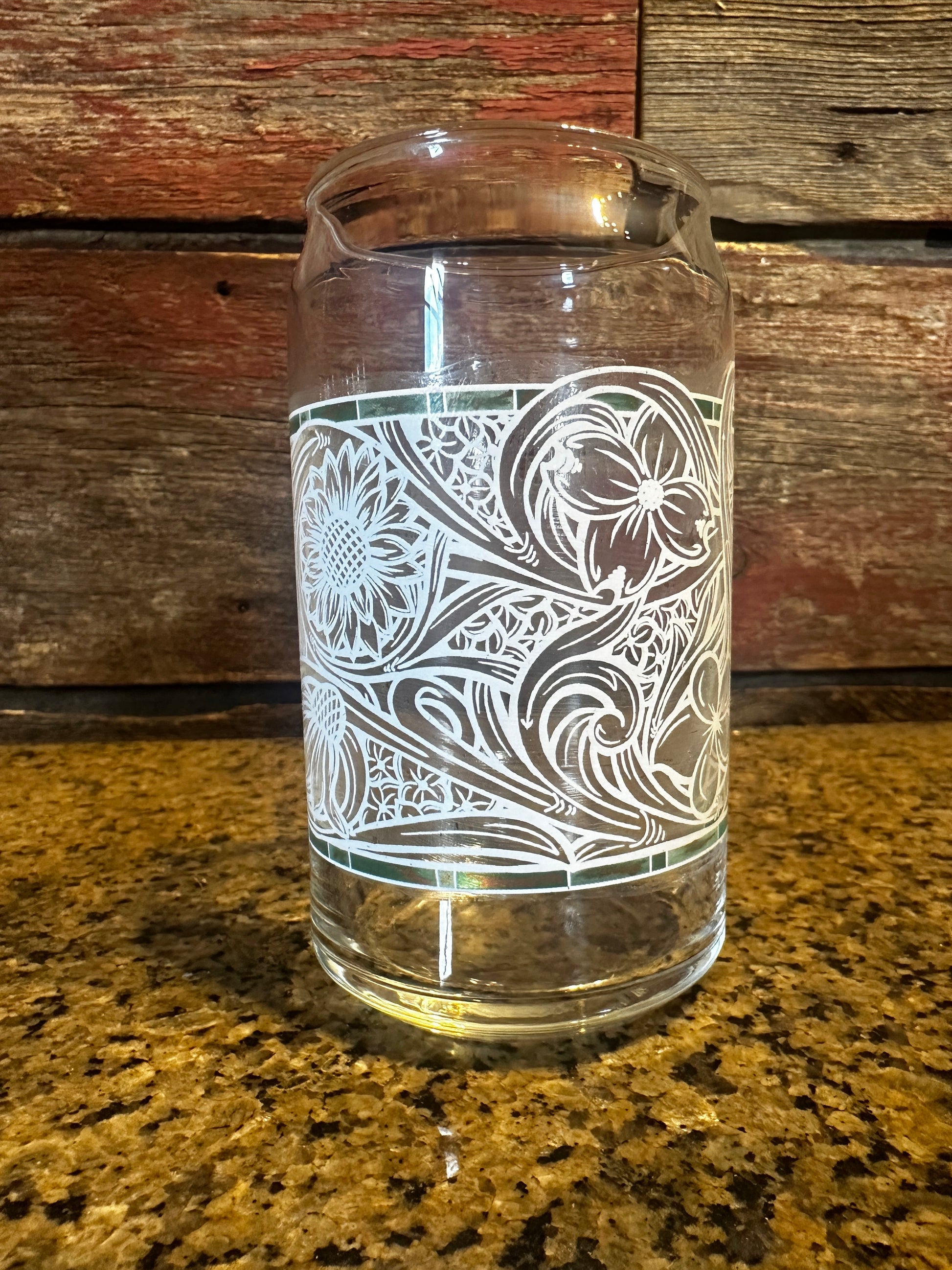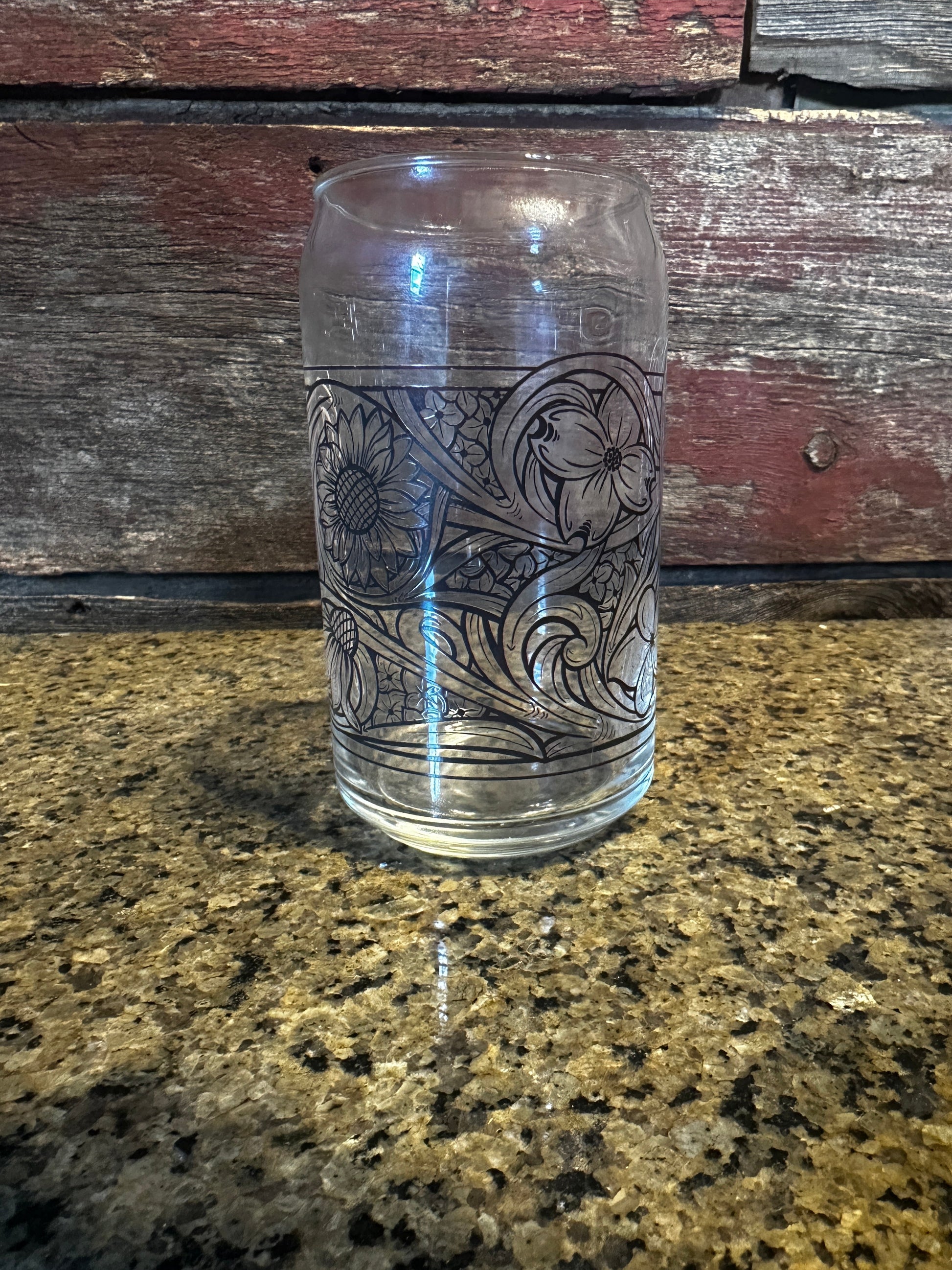 This can glass features a floral tooled design, meticulously crafted in the USA. Enjoy your favorite beverages in style with this uniquely detailed glassware.