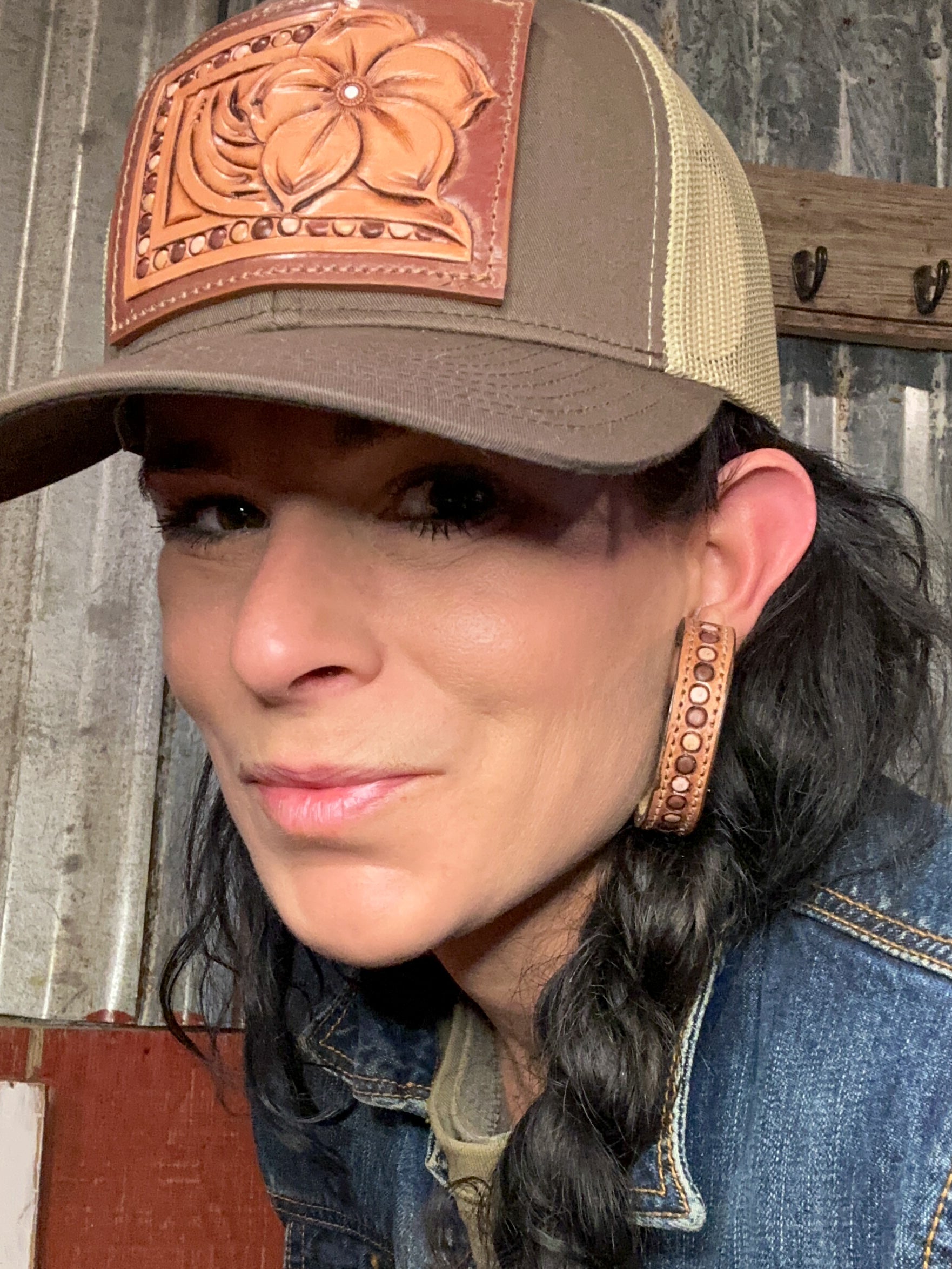 50 mm hoops; matches the Pansy Tooled Leather Patch Caps