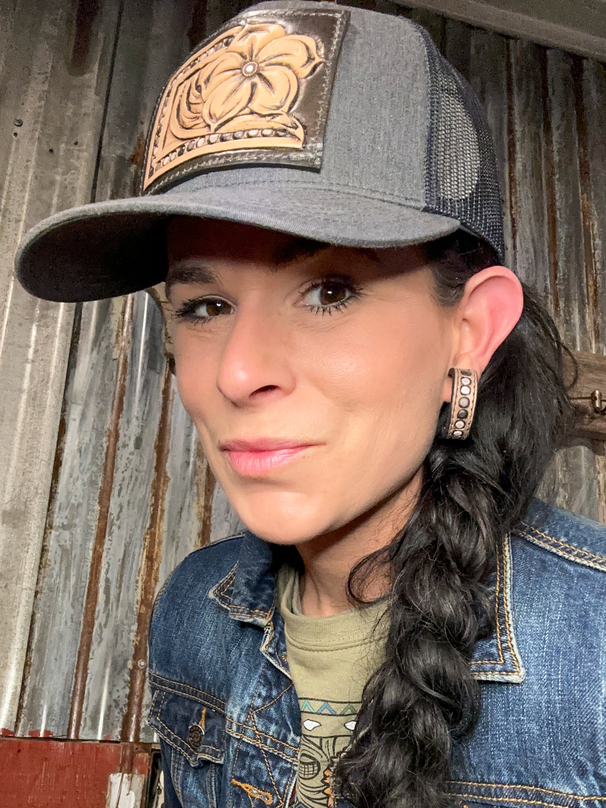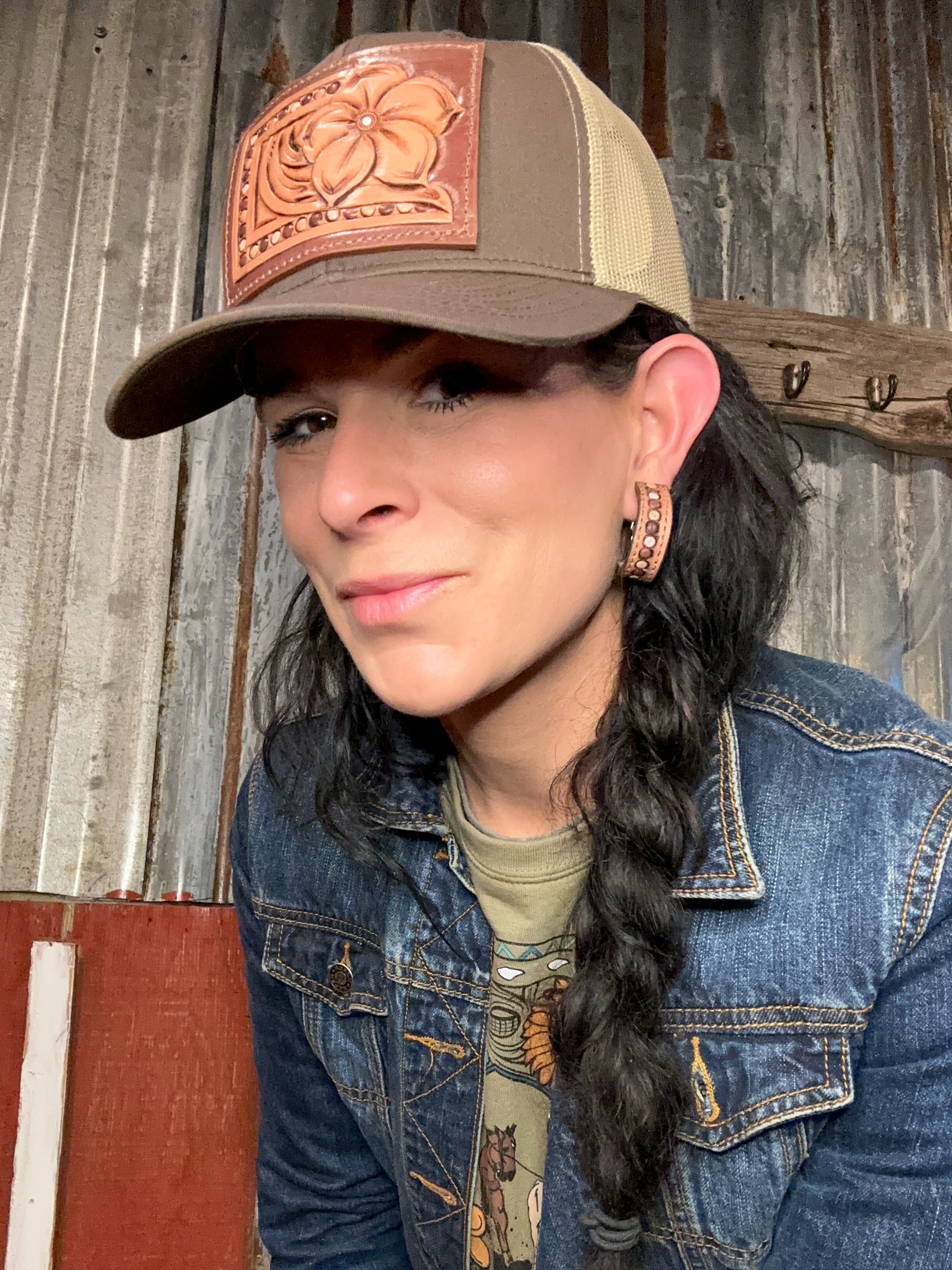 50 mm hoops; matches the Pansy Tooled Leather Patch Caps