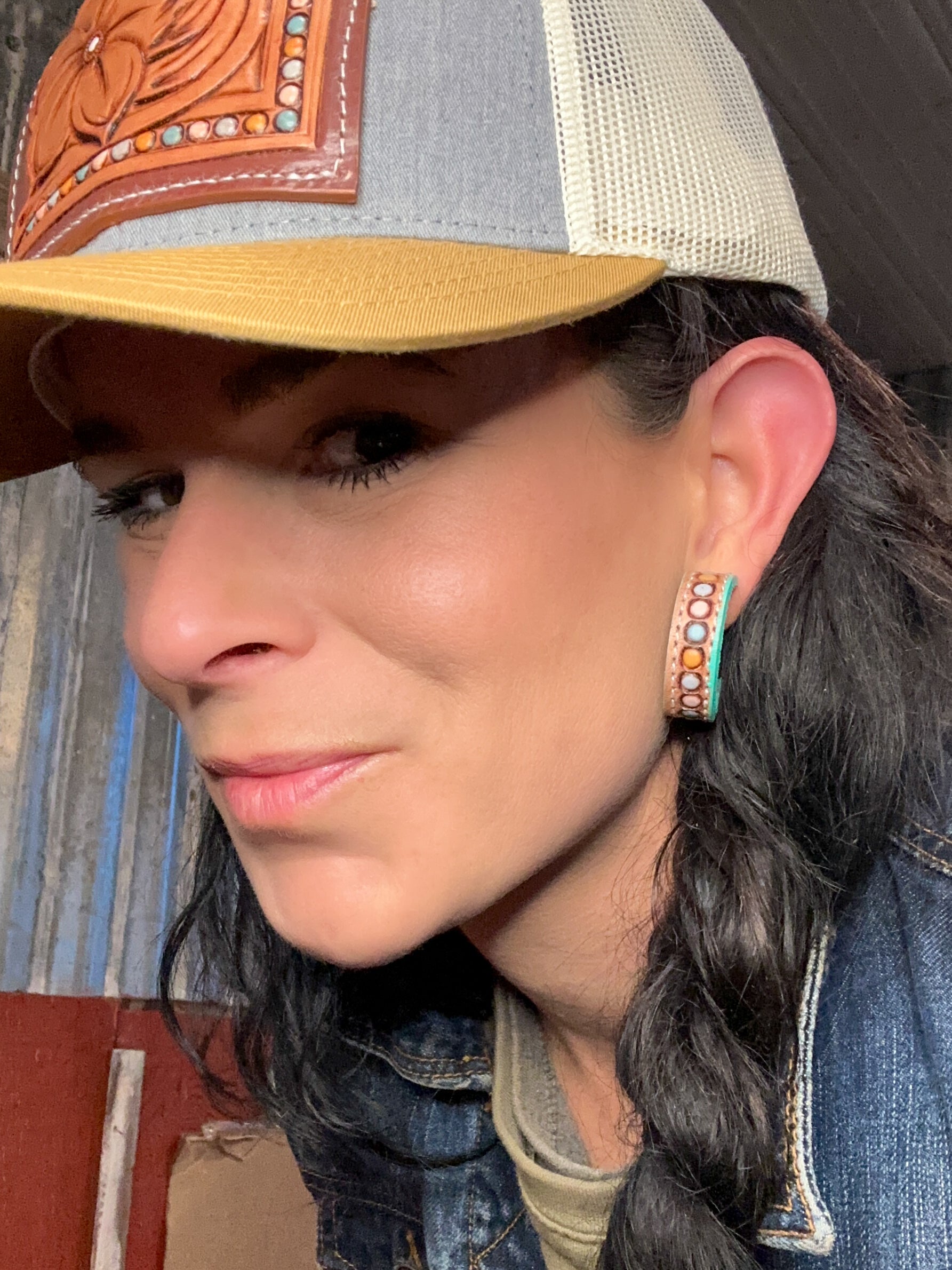 These hoops can be worn every day or at a rodeo. Bringing the same life as Vera to your outfit. Tooled leather dot pattern.