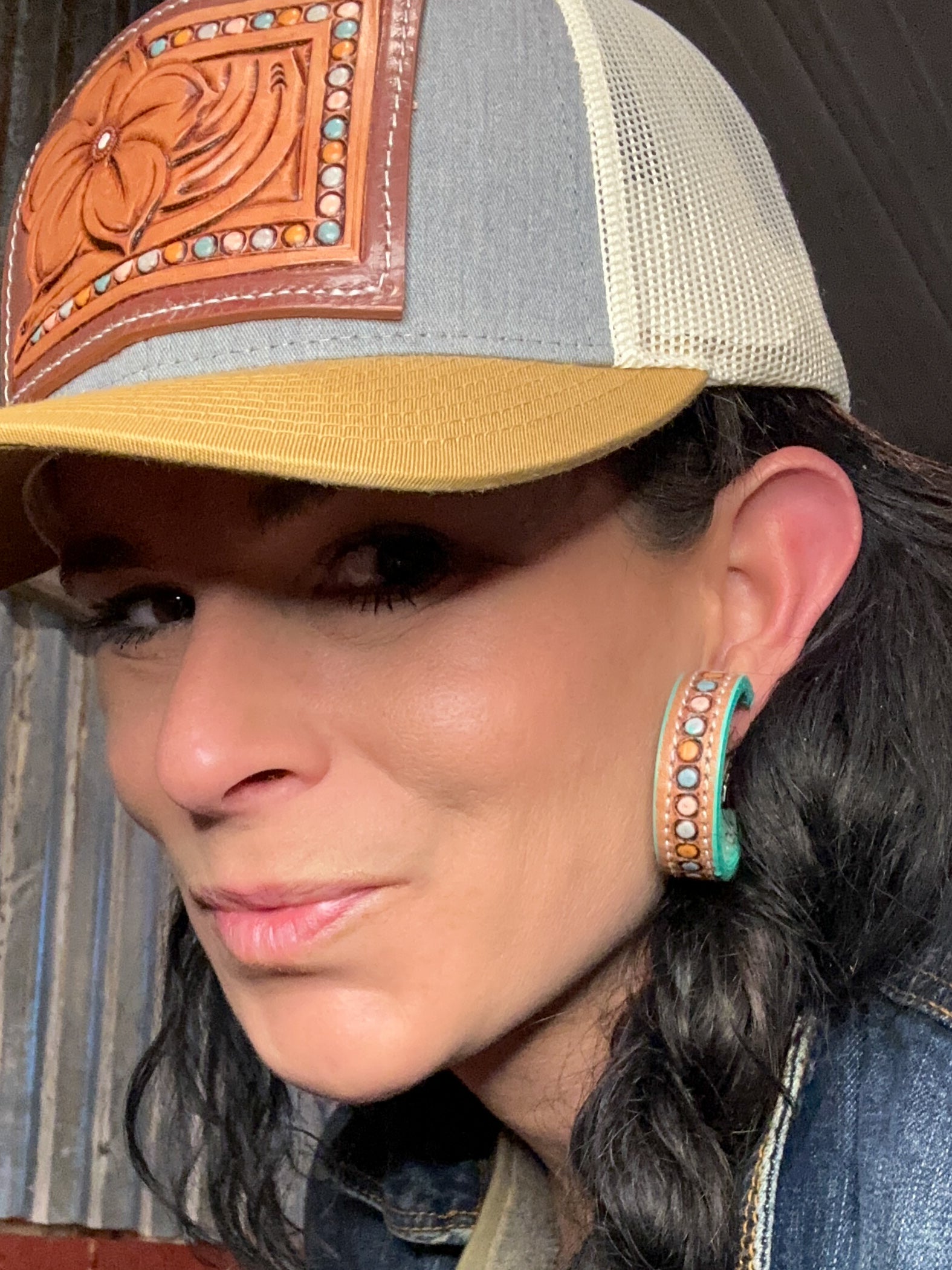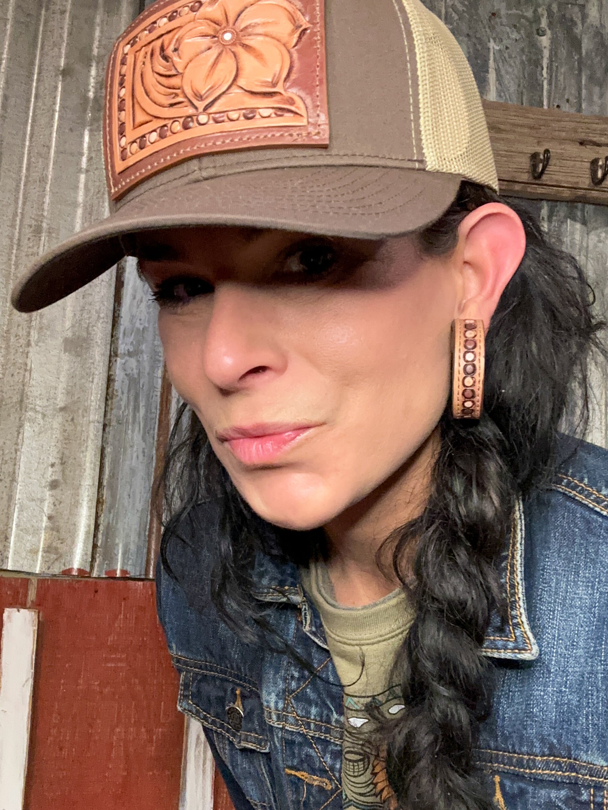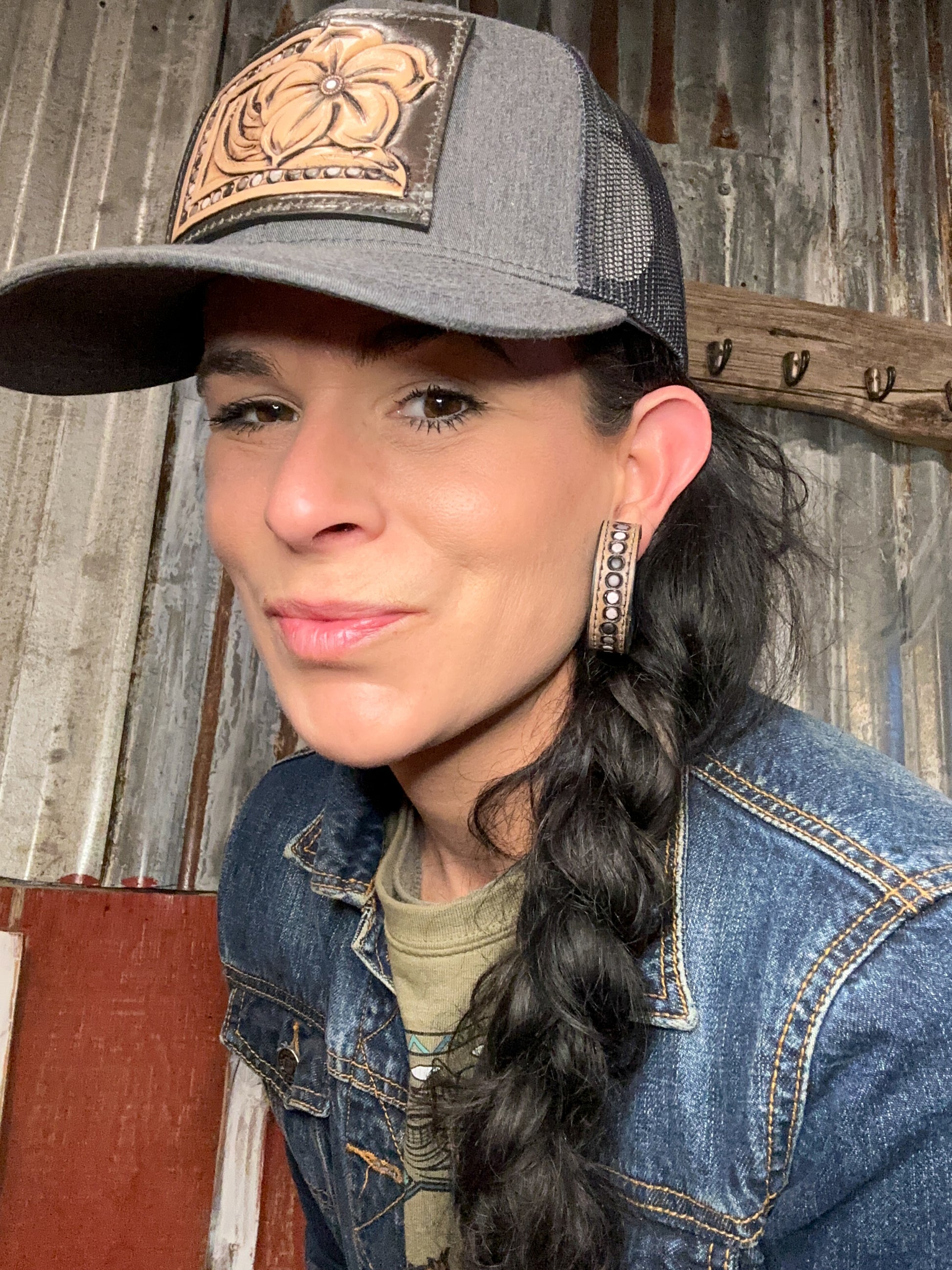 50 mm hoops; matches the Pansy Tooled Leather Patch Caps
