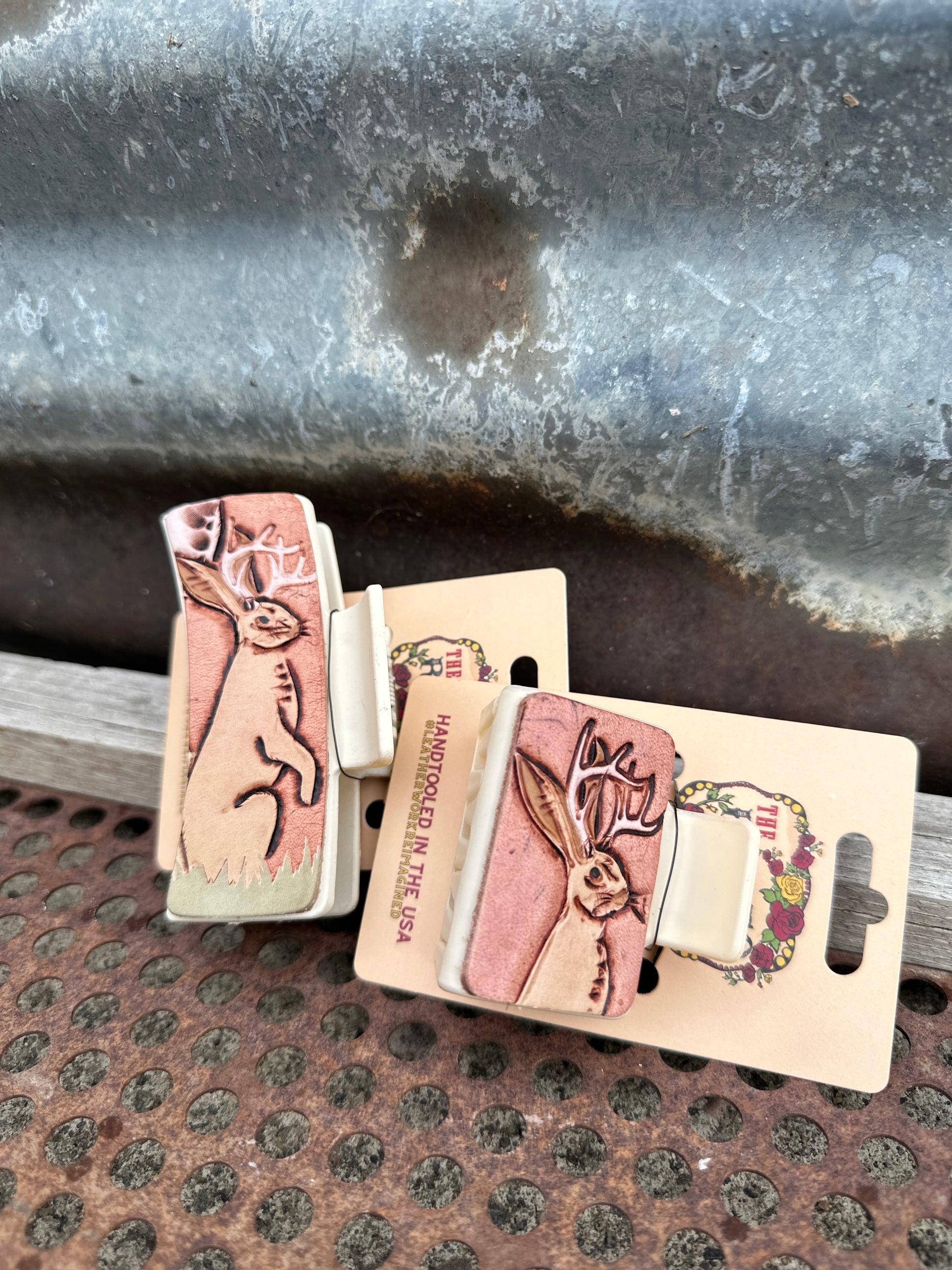 The elusive jackalope! Hand tooled and unique design by The Rodeo Rose. Tooled in our shop in South Dakota, USA. Inspired by the mythical west and is part of our Western Americana collection!