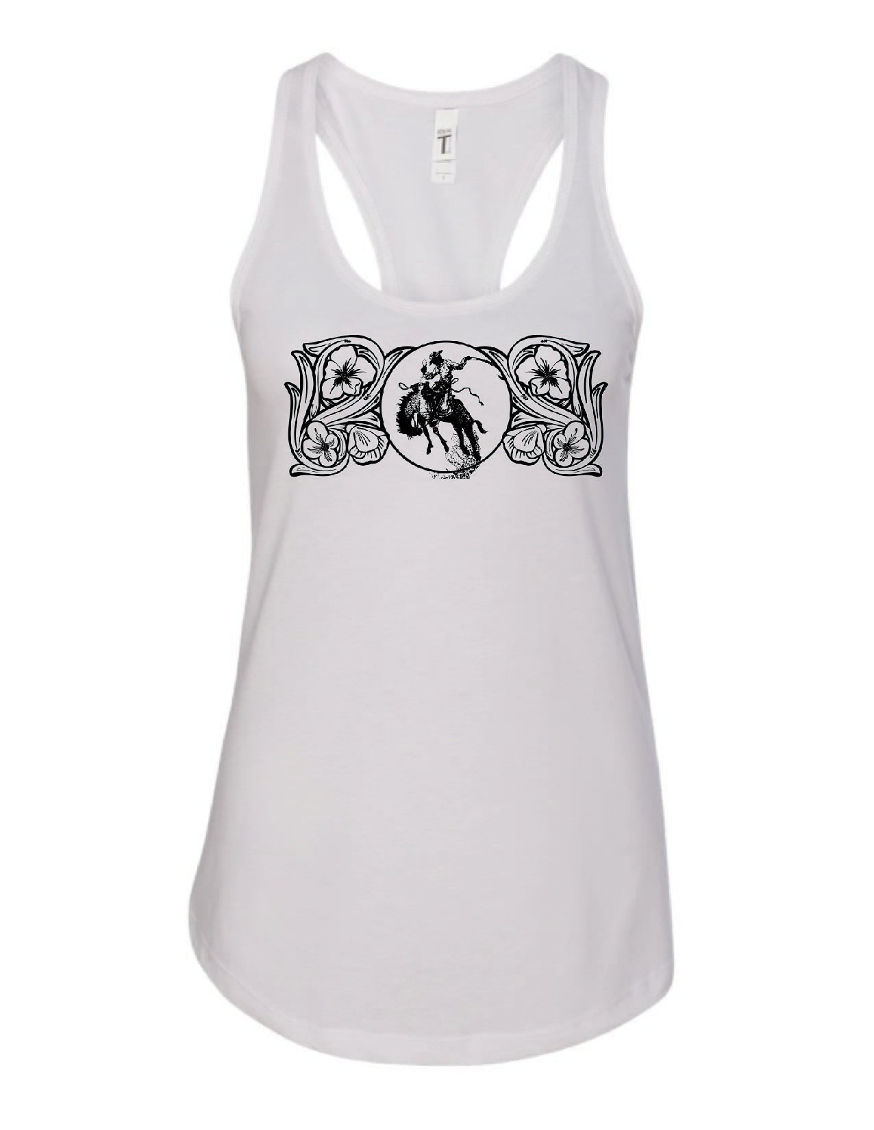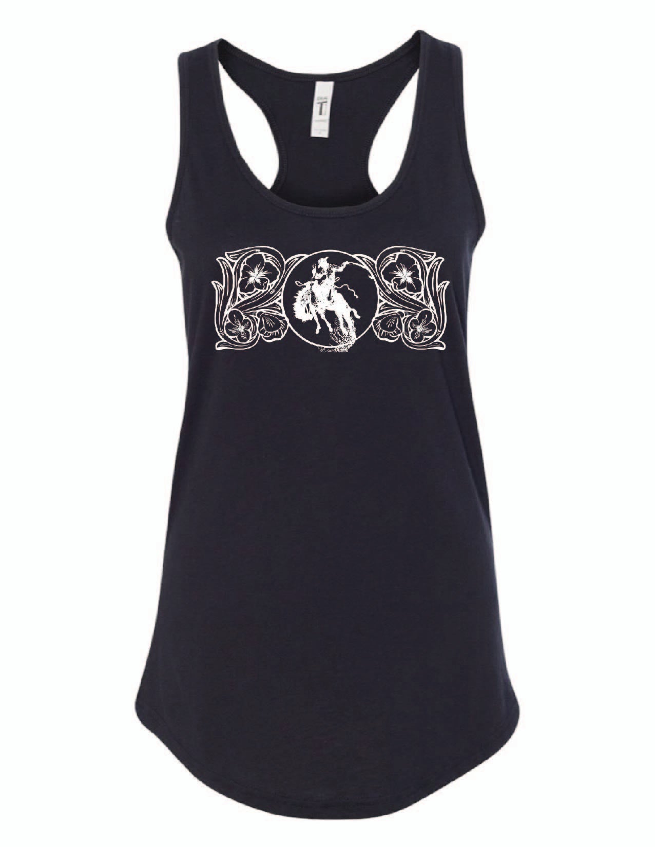 Unveiling the "Ranch Bronc" tank, a masterpiece by Amanda Rose exclusively at The Rodeo Rose. This tank boasts a hand-drawn ranch bronc surrounded by tooled leather floral scrolls, capturing the raw energy of the American West. Printed in our South Dakota shop at the base of the Black Hills, each tank embodies the spirit of the region. Embrace the thrill of the rodeo and showcase your love for western heritage with this unique tank from The Rodeo Rose.