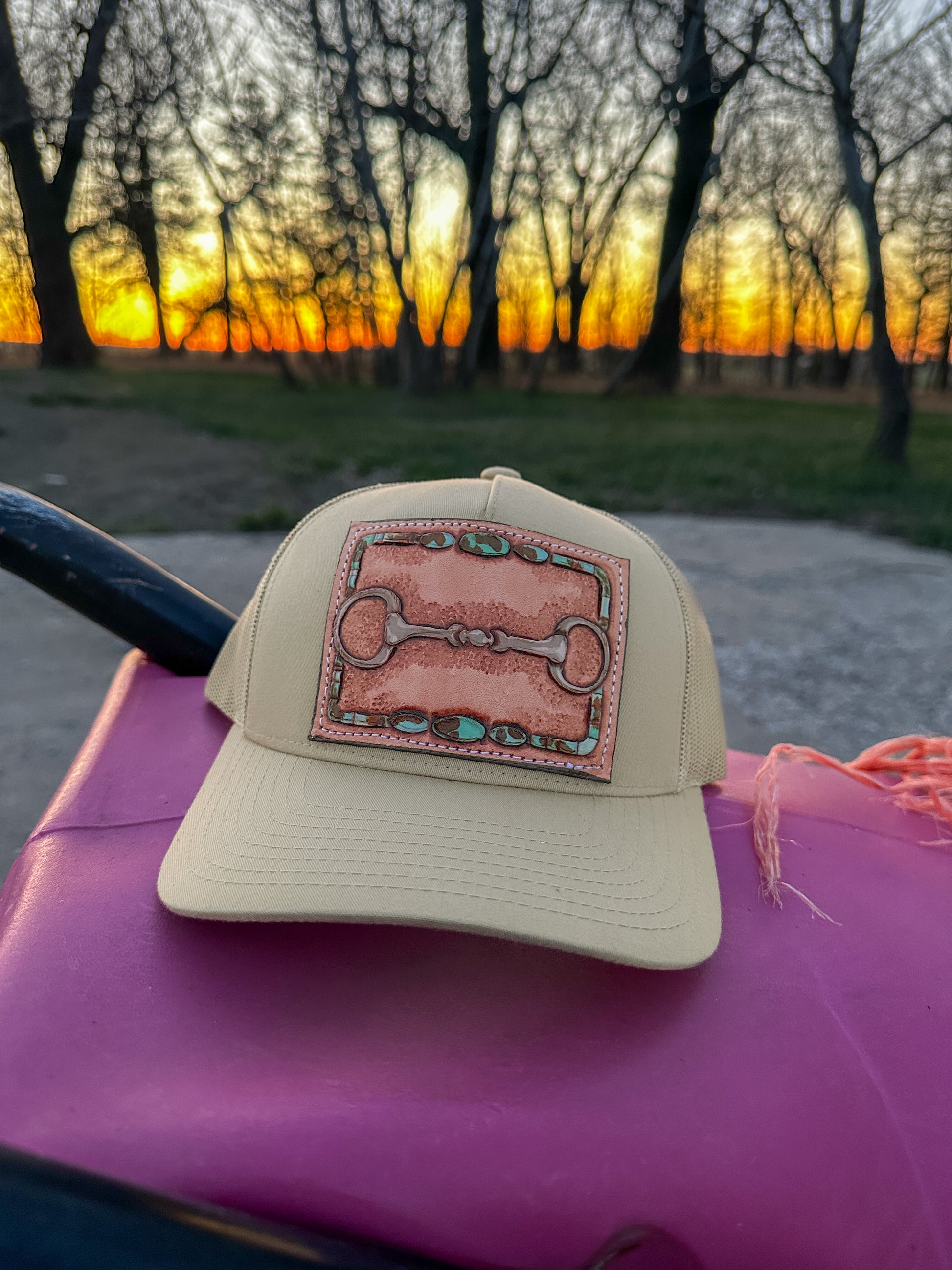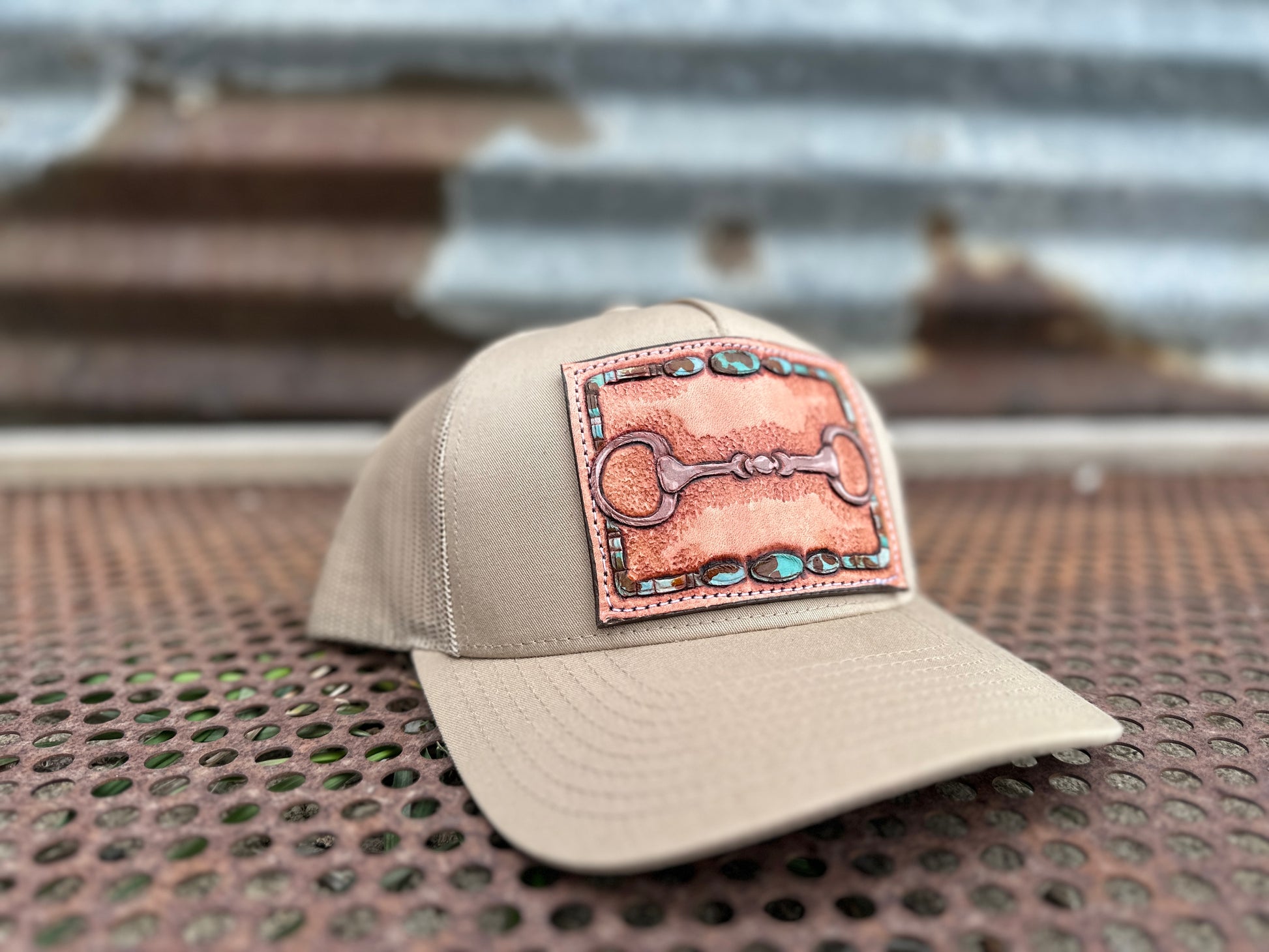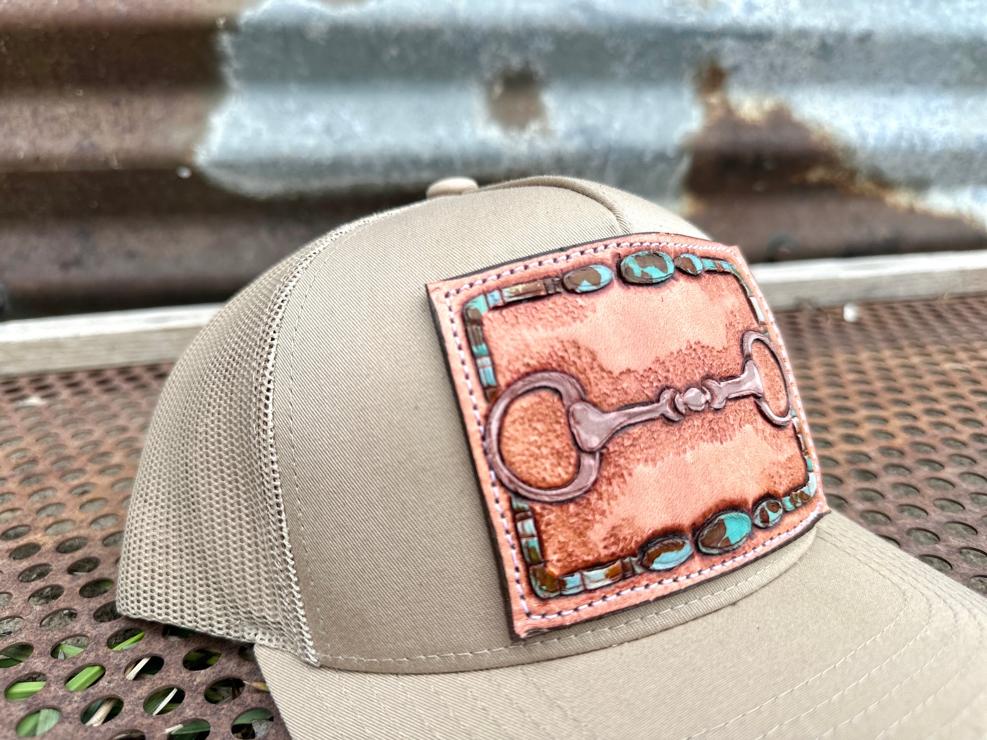 The snaffle bit is the epidemy of equestrian. This hand tooled snaffle bit cap with turquoise border screams class. Dress it up and wear with blazers or casual with the Canadian tuxedo. Hand tooled and antiqued in The Rodeo Rose shop in South Dakota USA!