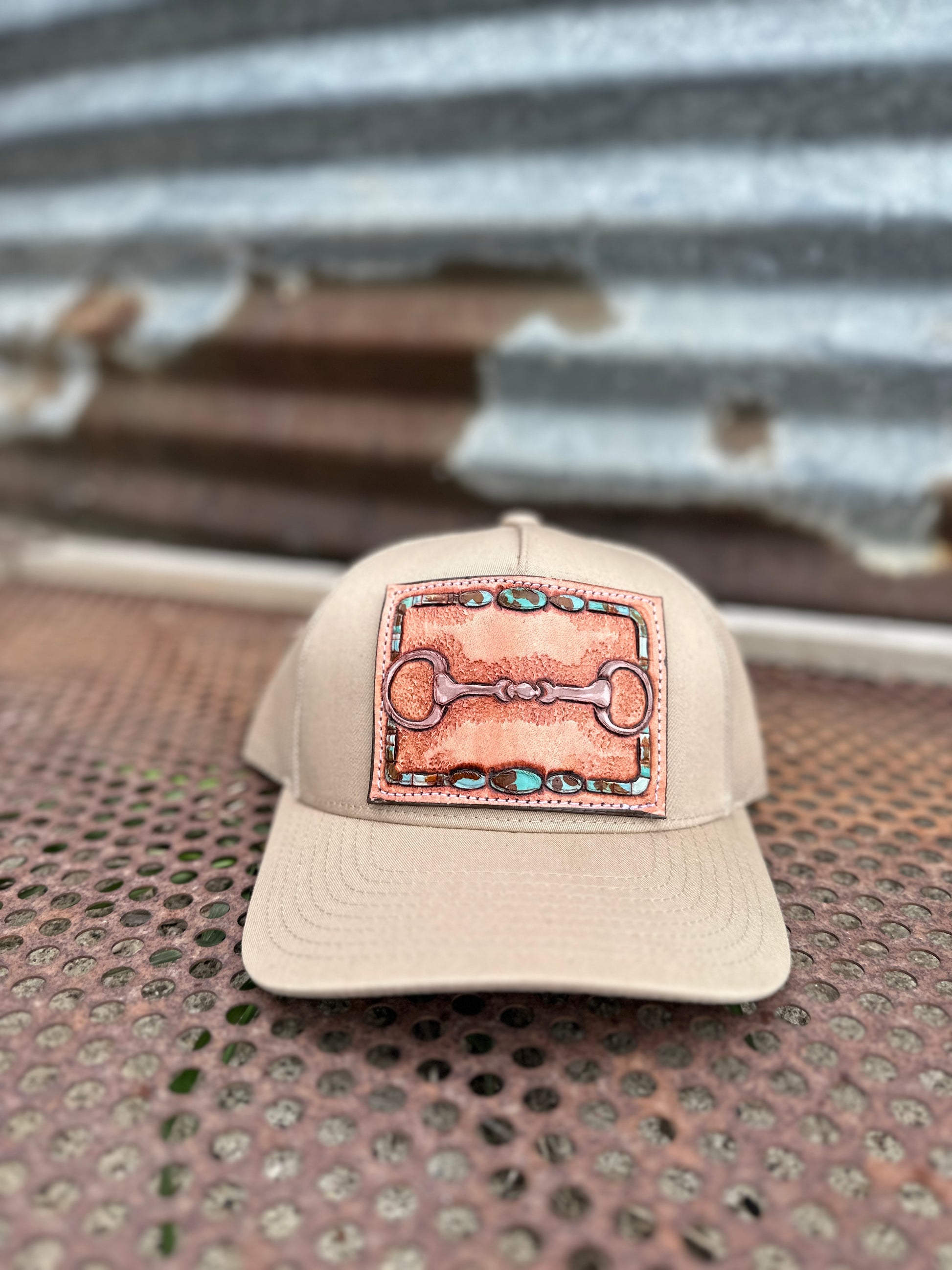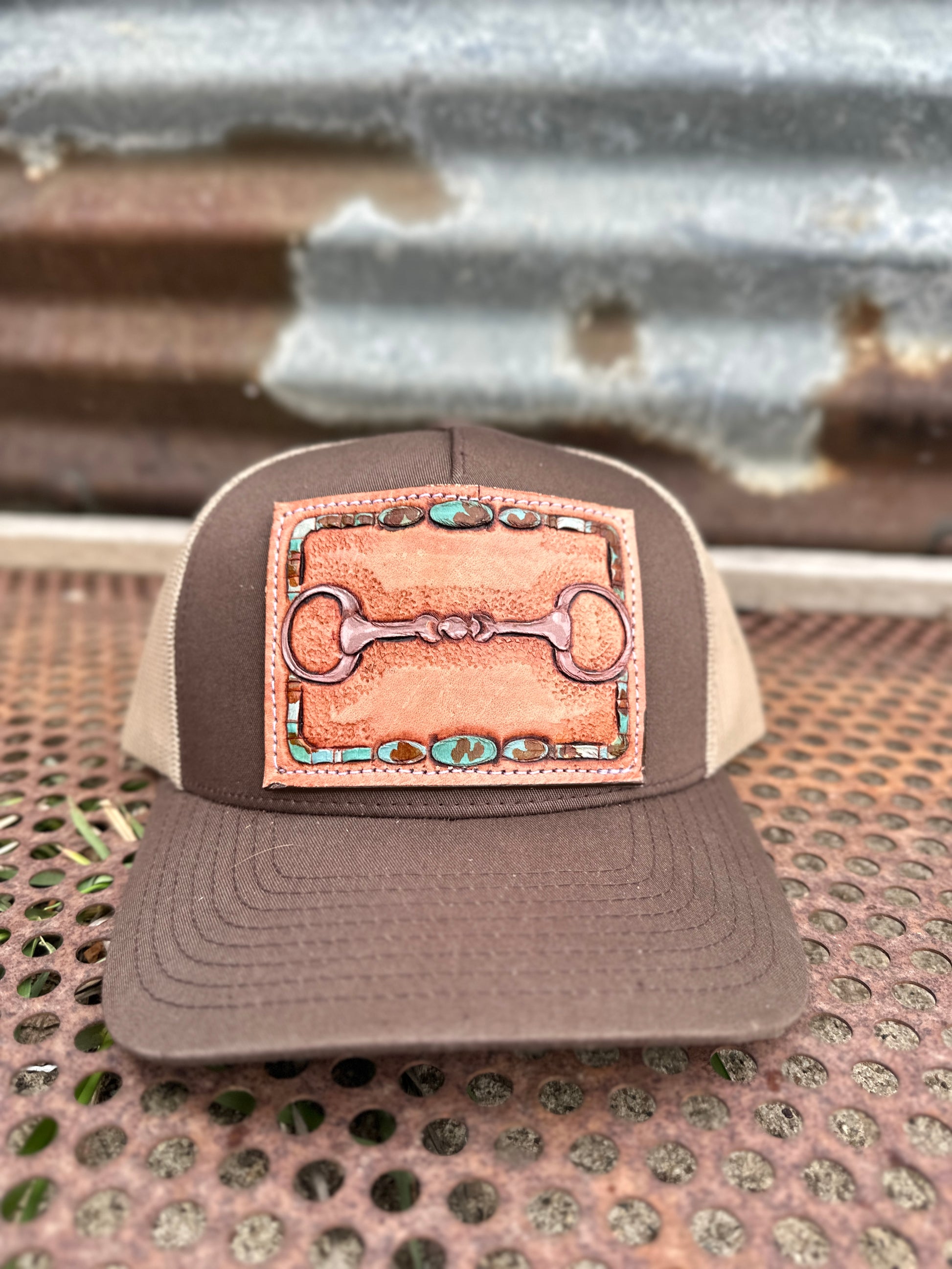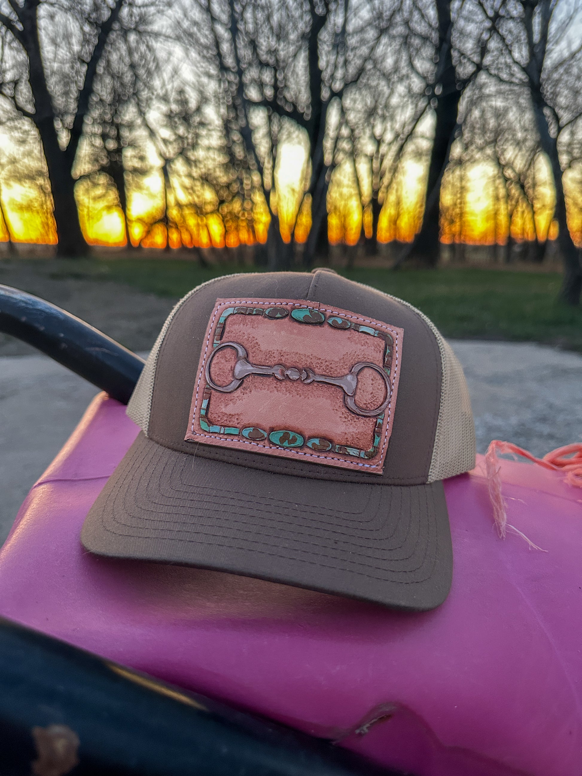 The snaffle bit is the epidemy of equestrian. This hand tooled snaffle bit cap with turquoise border screams class. Dress it up and wear with blazers or casual with the Canadian tuxedo. Hand tooled and antiqued in The Rodeo Rose shop in South Dakota USA!