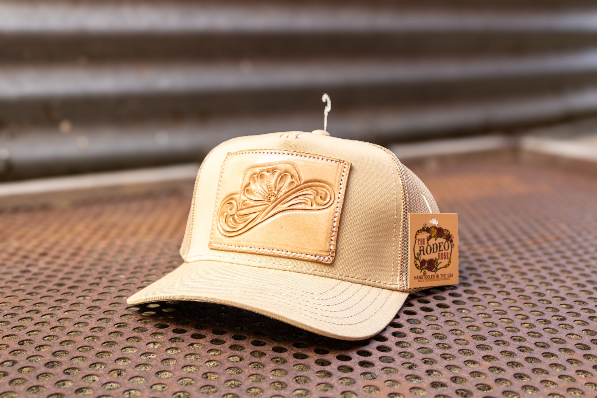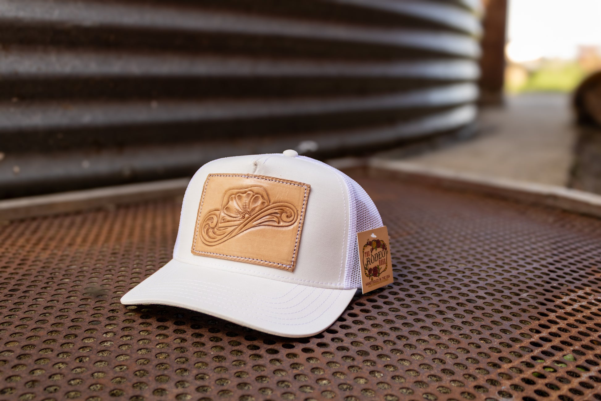 Tooled Cowboy Hat Leather Patch Mid Profile Trucker Cap