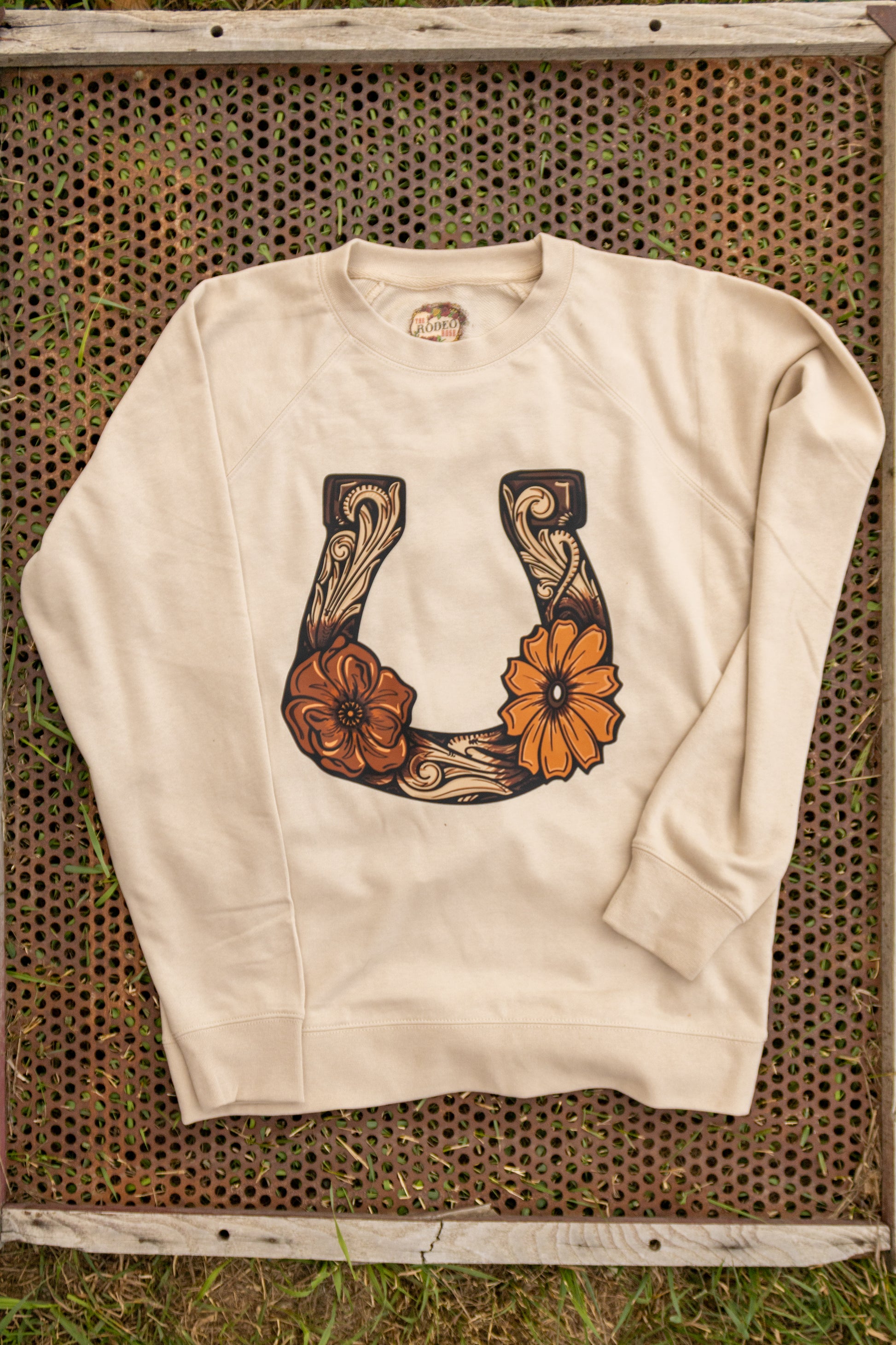 Make a bold statement with the Tooled Horseshoe crewneck, featuring a hand-drawn graphic by Amanda Rose of The Rodeo Rose. The intricate tooled scroll work and two striking tooled leather flowers demand attention, printed at the base of the Black Hills in South Dakota. This lightweight crewneck is designed for those who aren’t afraid to stand out and own their unique style with fearless confidence. Wear it loud, wear it proud. Over a collared shirt, by itself and MORE!