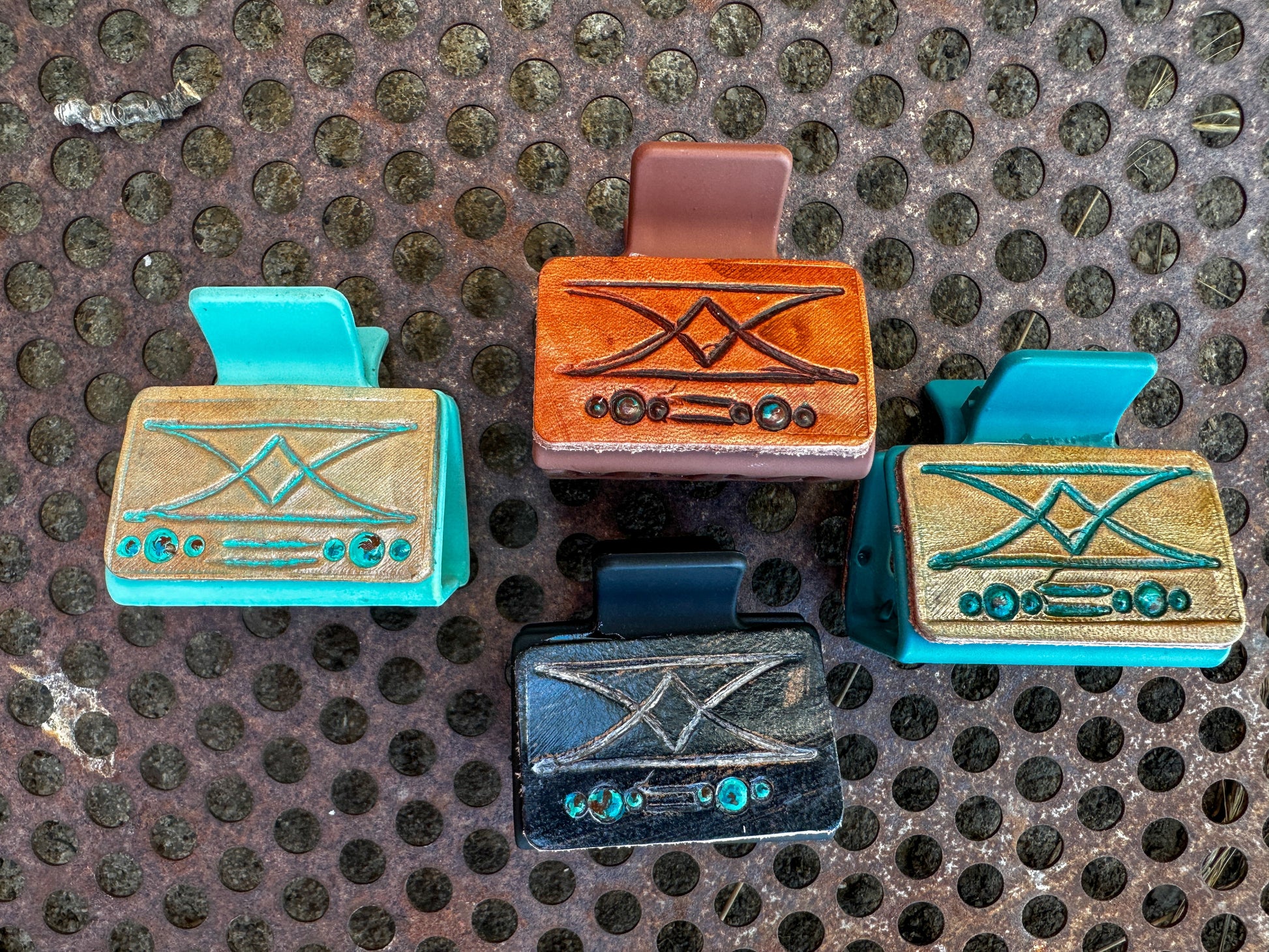 Introducing our charming Hand-Tooled Leather Hair Clip, a petite yet impactful accessory measuring 2 inches by 2 inches. Crafted with meticulous care in The Rodeo Rose shop, nestled at the base of South Dakota's iconic Black Hills. Featuring a hand cut boot stitch design with turquoise beads, each detail is lovingly hand-painted to perfection. Assembled with precision, this hair clip is a testament to Western craftsmanship and timeless style. Add a touch of Western flair to your hairstyle with this unique piece from The Rodeo Rose collection.