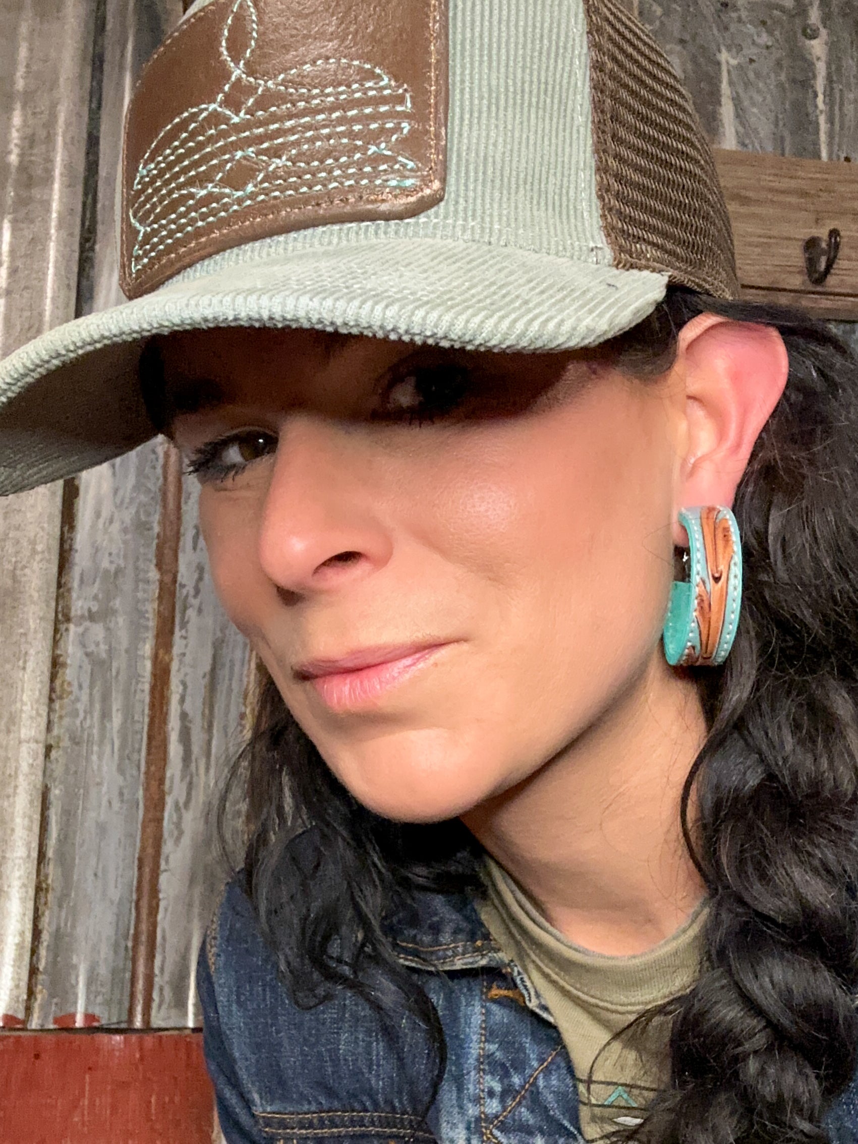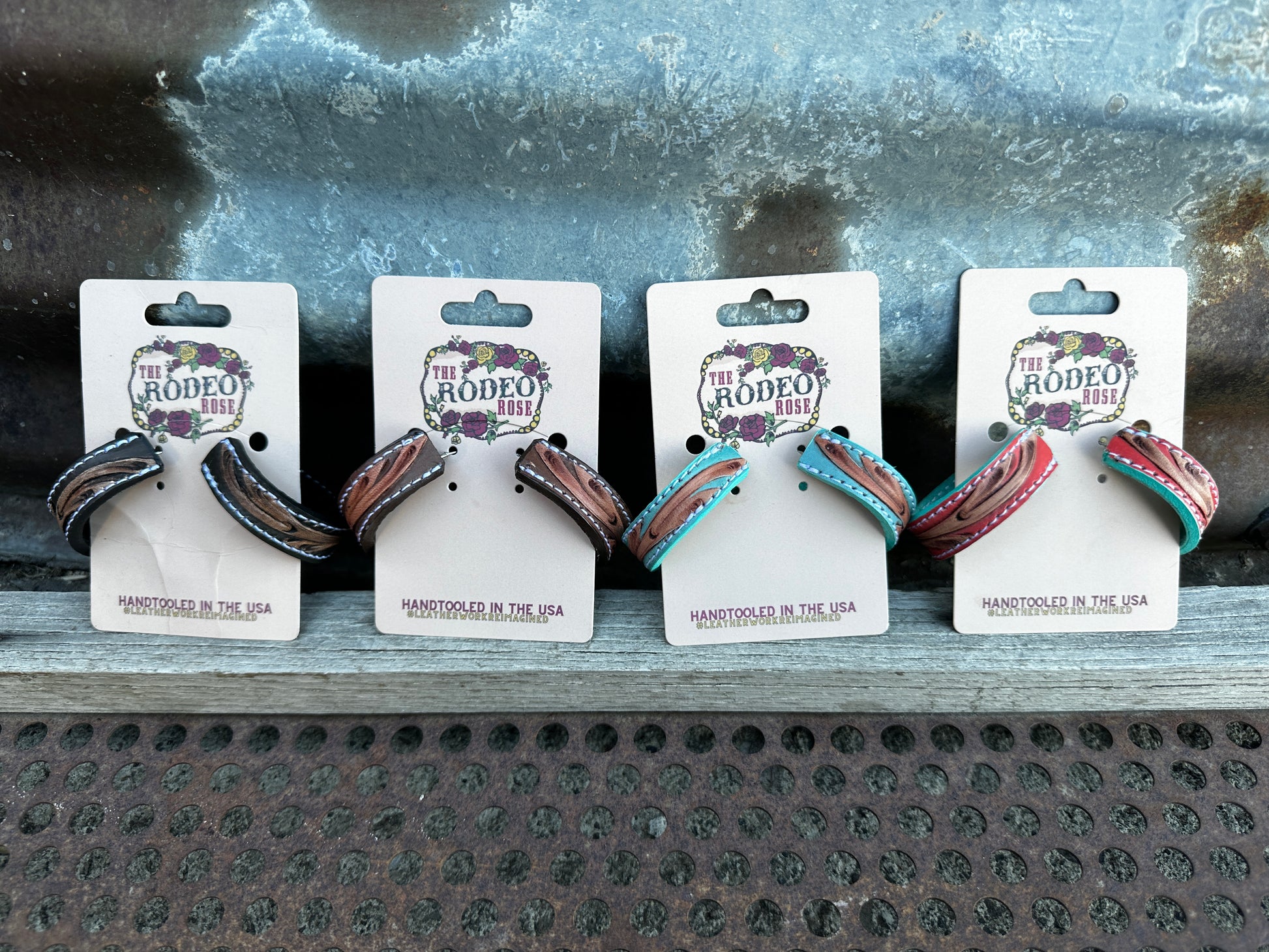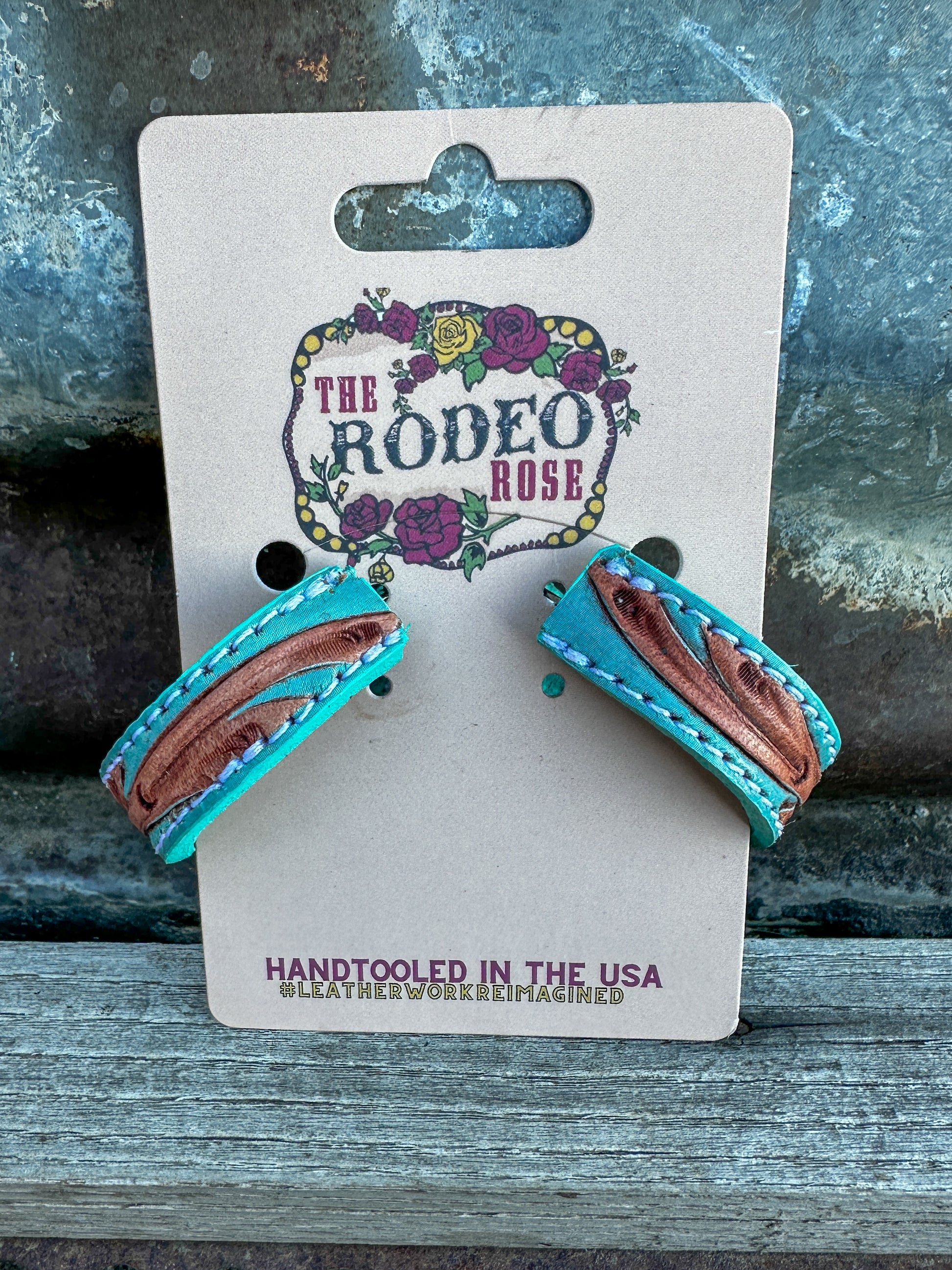 Beaded hand tooled turquoise pattern on leather Vera hoops! Made in The Rodeo Rose shop at the base of the Black Hills in South Dakota. These hoops are extremely lightweight and very easy to wear.